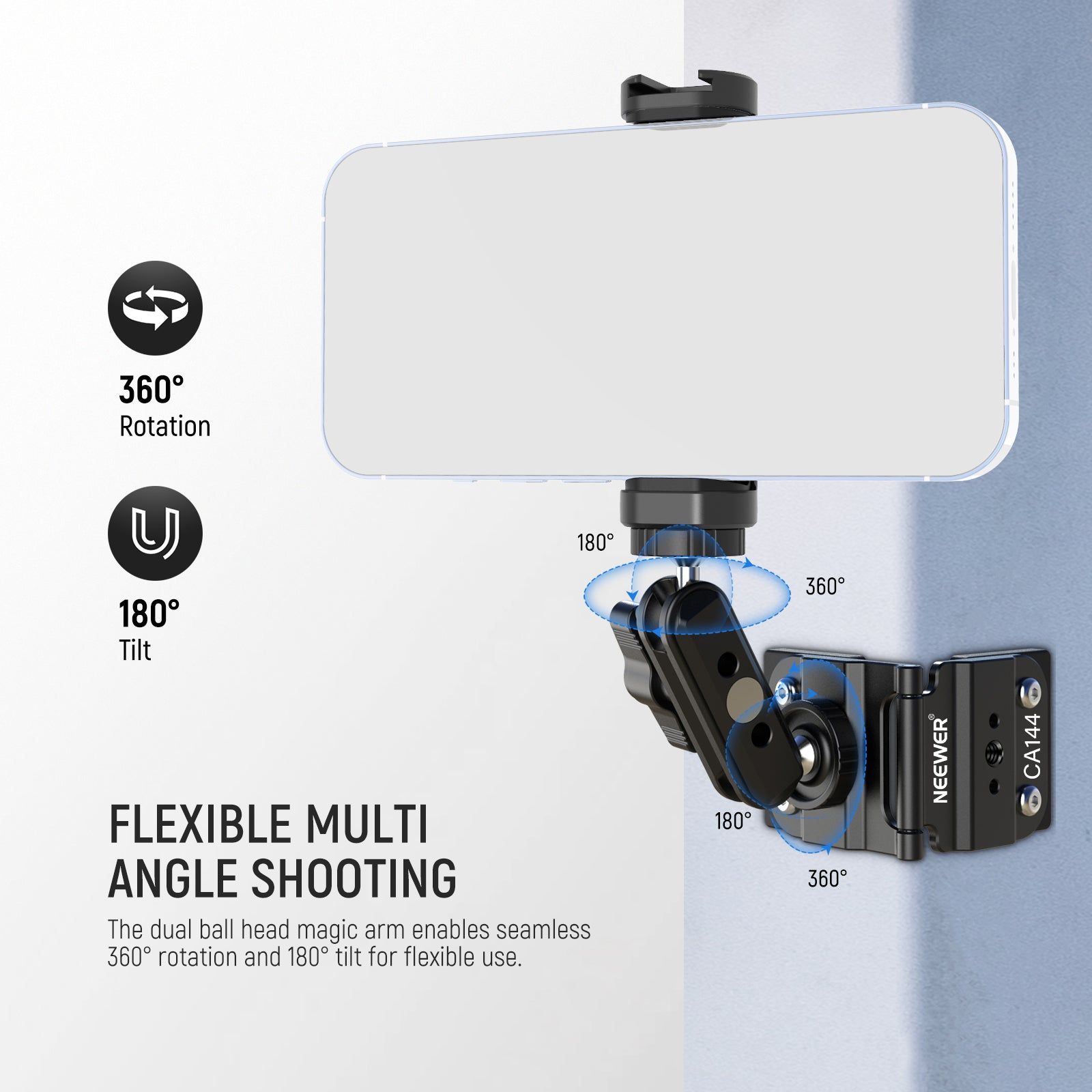 - 360° Swivel & 90° Tilt- Made of metal, the action camera fence mount includes a dual ball head magic arm for seamless 360° swivel and 90° tilt. Whether you're capturing action packed scenes or stunning scenery, this camera fence mount ensures that you can effortlessly find the optimal angles for your recordings