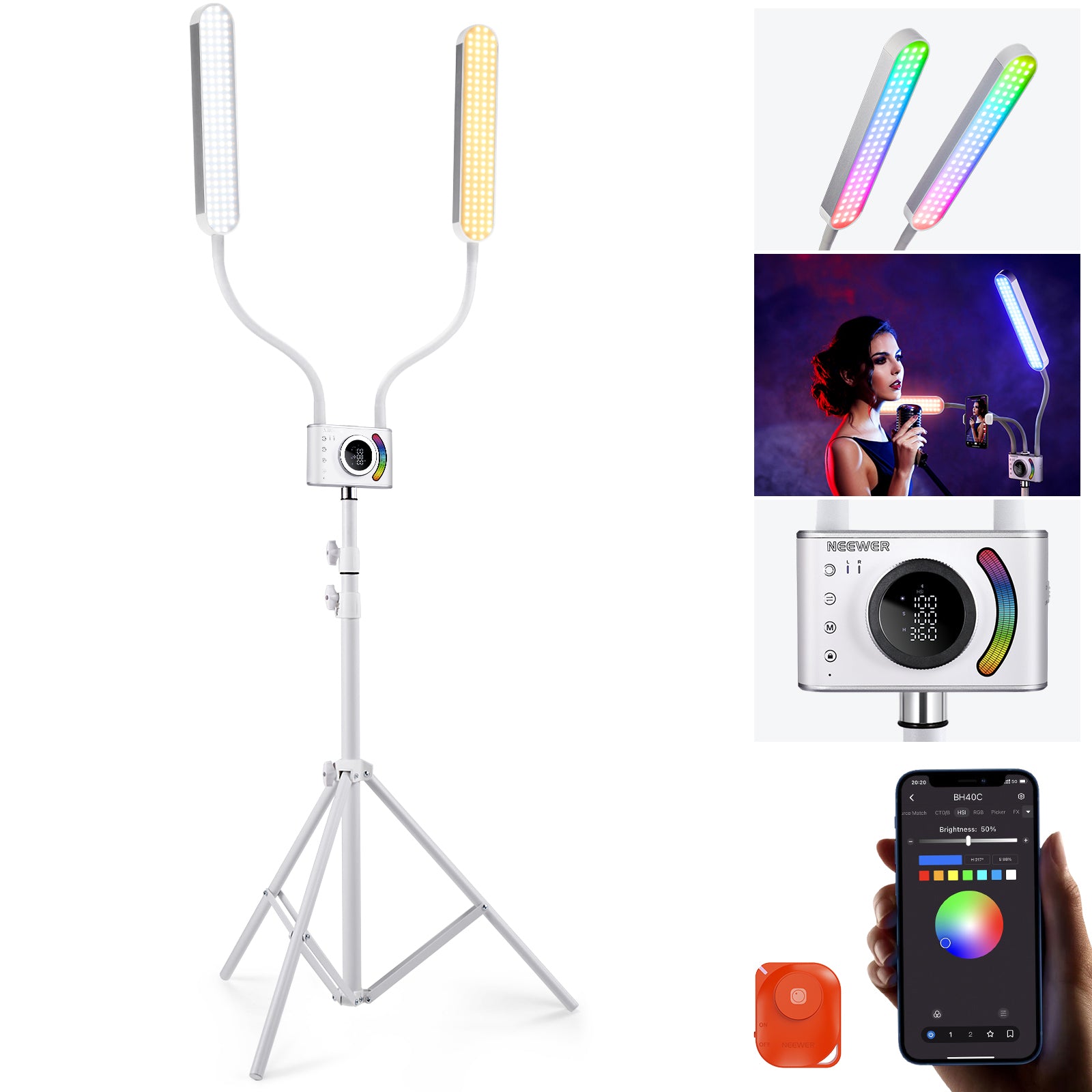 - Luz de esteticista RGB flexible : NEEWER BH40C es una luz de relleno LED de esteticista RGB de 36 W para belleza, maquillaje, extensiones de pestañas, manicuras, tatuajes, transmisiones en vivo, vlogs, retratos y más. Tiene 528 LED, CRI98+ para alta fidelidad de color y una iluminancia de 4600 lux/0,5 m para un alto brillo. Dos cabezales de luz se pueden controlar y doblar de forma independiente o simultánea para una iluminación envolvente sin sombras.