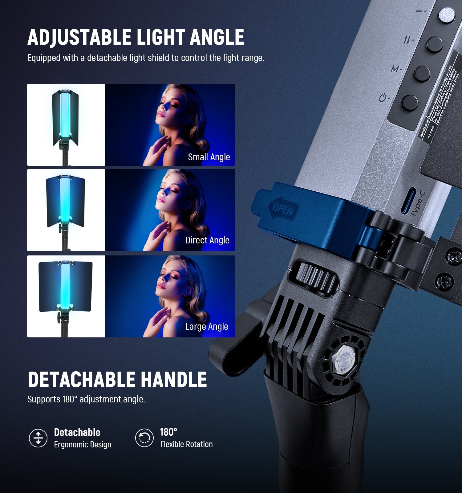 - 296 LED y tecnología de mezcla RGBWW : la varilla de luz RGB2 mejorada está integrada con 296 LED RGB a todo color, que emiten una luz suave y uniforme con una iluminación máxima de 1860 Lux/0,5 m y una amplia temperatura de color de 2500-10000 K. La tecnología RGBWW combina con precisión la luz roja, verde, azul, blanca fría y blanca cálida, lo que ofrece una amplia gama que cubre más del 90 % del espacio de color Rec. 2020. Además, presenta una fidelidad de color superior (CRI98+/TLCI97+) y permite ajustes precisos de GM±50.