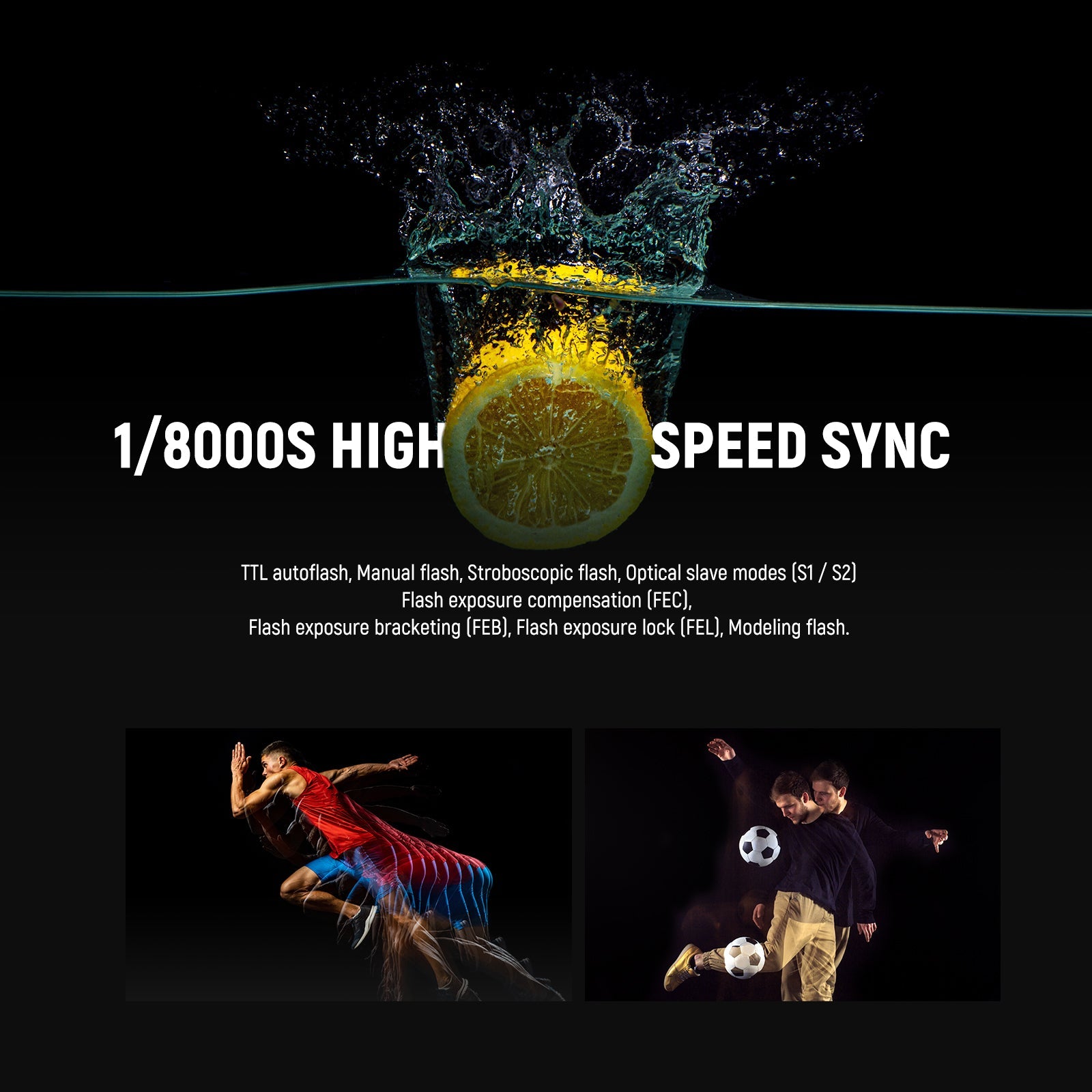 - sincronización de alta velocidad (hasta 1/8000s) para congelar el movimiento.