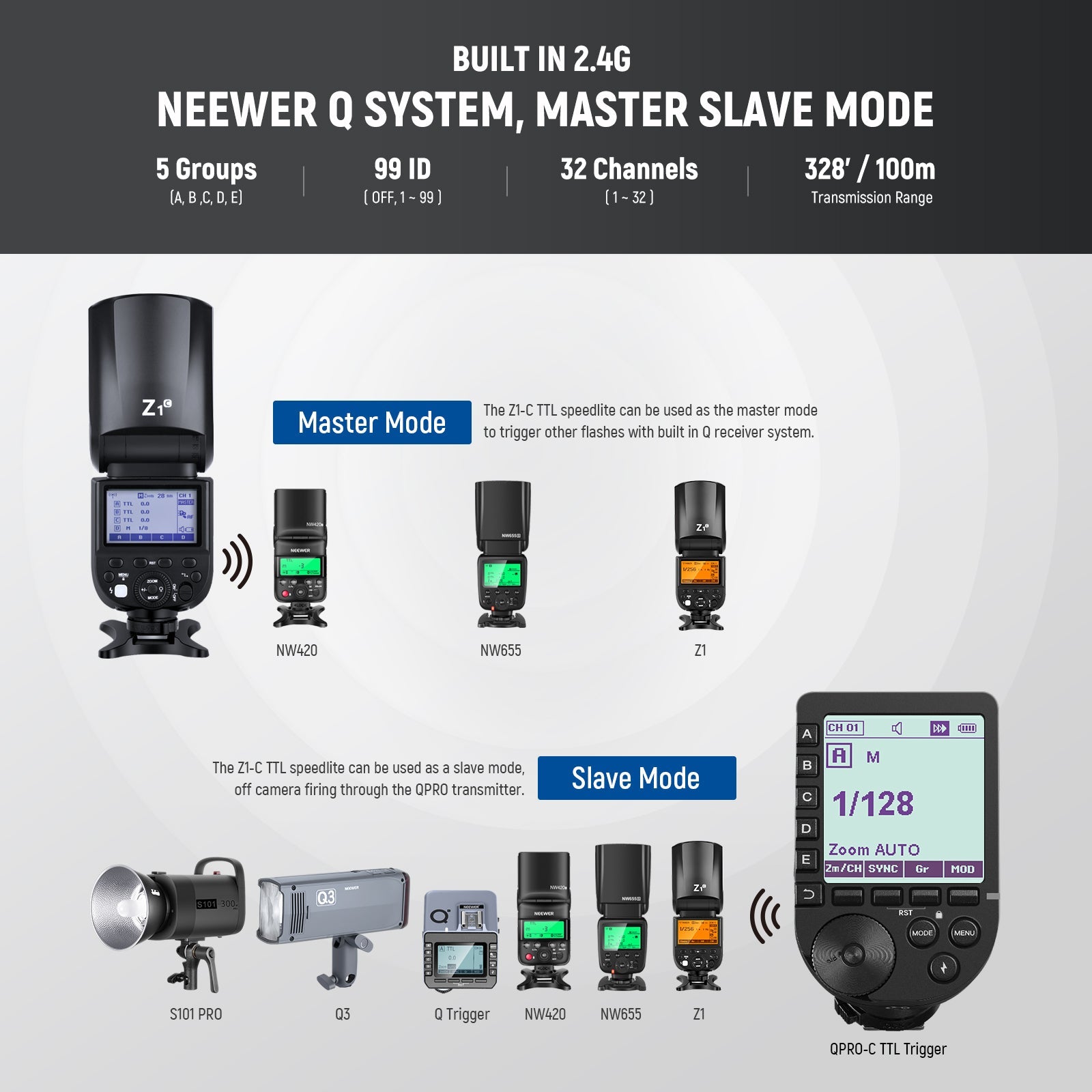 - Sistema Q inalámbrico de 2,4 GHz: con 4 grupos (A/B/C/D), 32 canales (1-32) y 99 ID (1-99) es compatible con transmisores QC/QPro-C TTL (no incluidos). El flash también se puede utilizar como flash maestro/esclavo para controlar otros flashes con un rango de transmisión de hasta 328'/100 m (sin obstáculos). La iluminación de la luz es uniforme y la salida es estable, lo que amplía enormemente sus posibilidades creativas para la fotografía con flash. Además, admite actualizaciones de firmware USB.