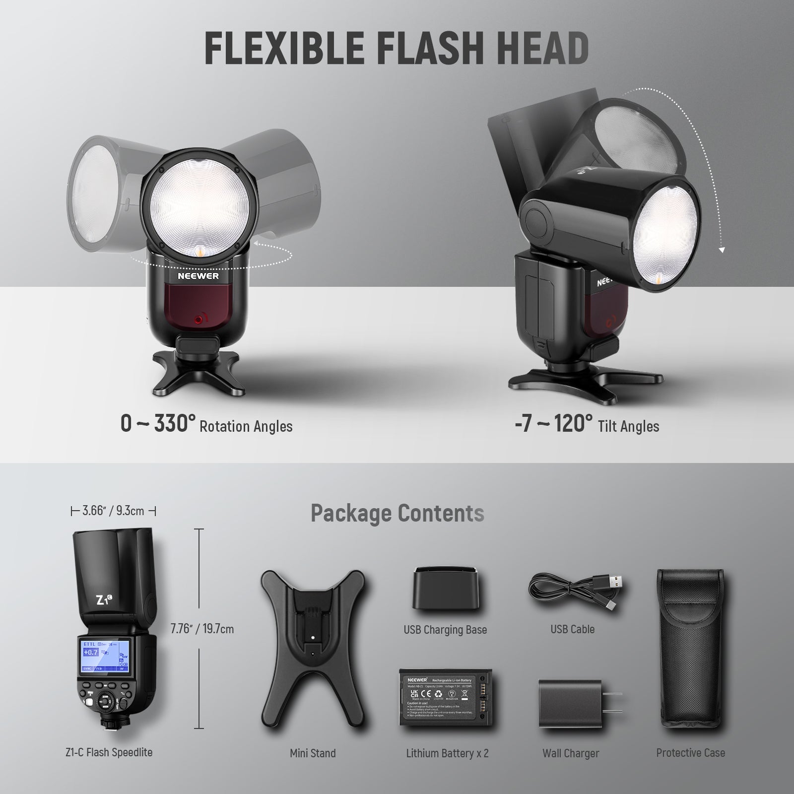 - Potentes funciones: incluyen alta potencia de 76 W, flash automático TTL, flash manual, flash estroboscópico, modos esclavos ópticos (S1/S2), sincronización de alta velocidad de 1/8000 s, sincronización de primera/segunda cortina, compensación de exposición del flash (FEC), horquillado de exposición con flash (FEB), bloqueo de exposición con flash (FEL), flash de modelado y más. El flash se puede ajustar de 0° a 330° horizontalmente y de -7° a 120° verticalmente, lo que le brinda más flexibilidad al disparar