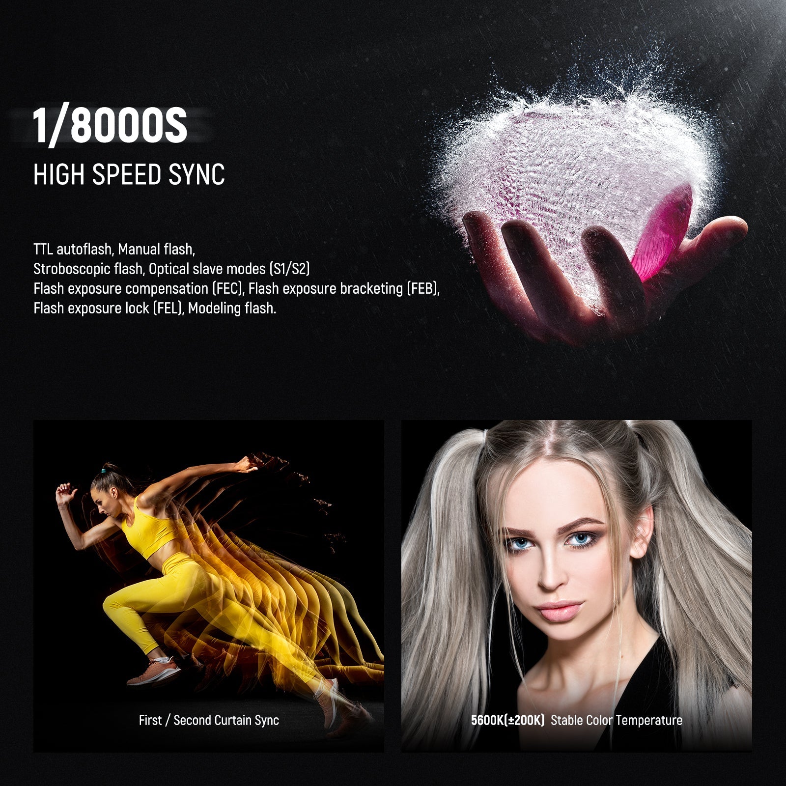 - Métodos de sincronización: sincronización de alta velocidad (hasta 1/8000s), sincronización de primera/segunda cortina