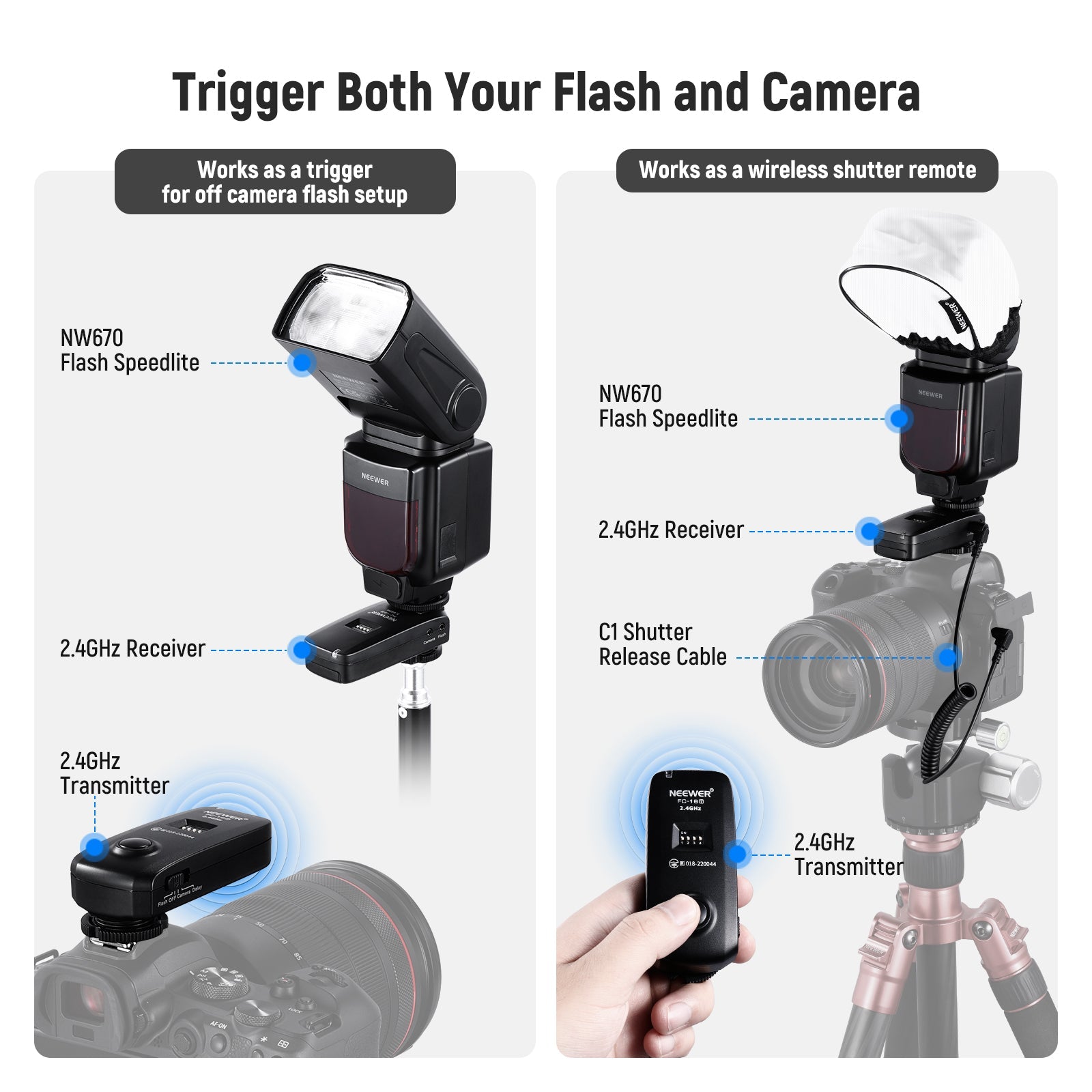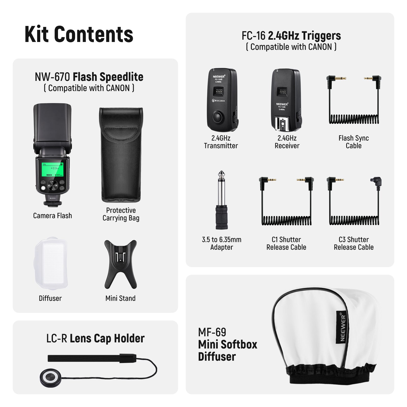 - El kit incluye: Flash de enfoque automático NEEWER Pro E-TTL + Disparador de flash de cámara inalámbrico 3 en 1 de 2,4 GHz con función de control remoto de cámara + 2 cables (cable C1 + cable C3) para control remoto + difusor de flash duro + suave Difusor de flash + soporte para tapa de lente.