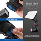 - Simplemente despliega el difusor y coloca el frente, ¡y listo! La apertura elástica le permite conectar el difusor a la mayoría de los flashes con montura de zapata