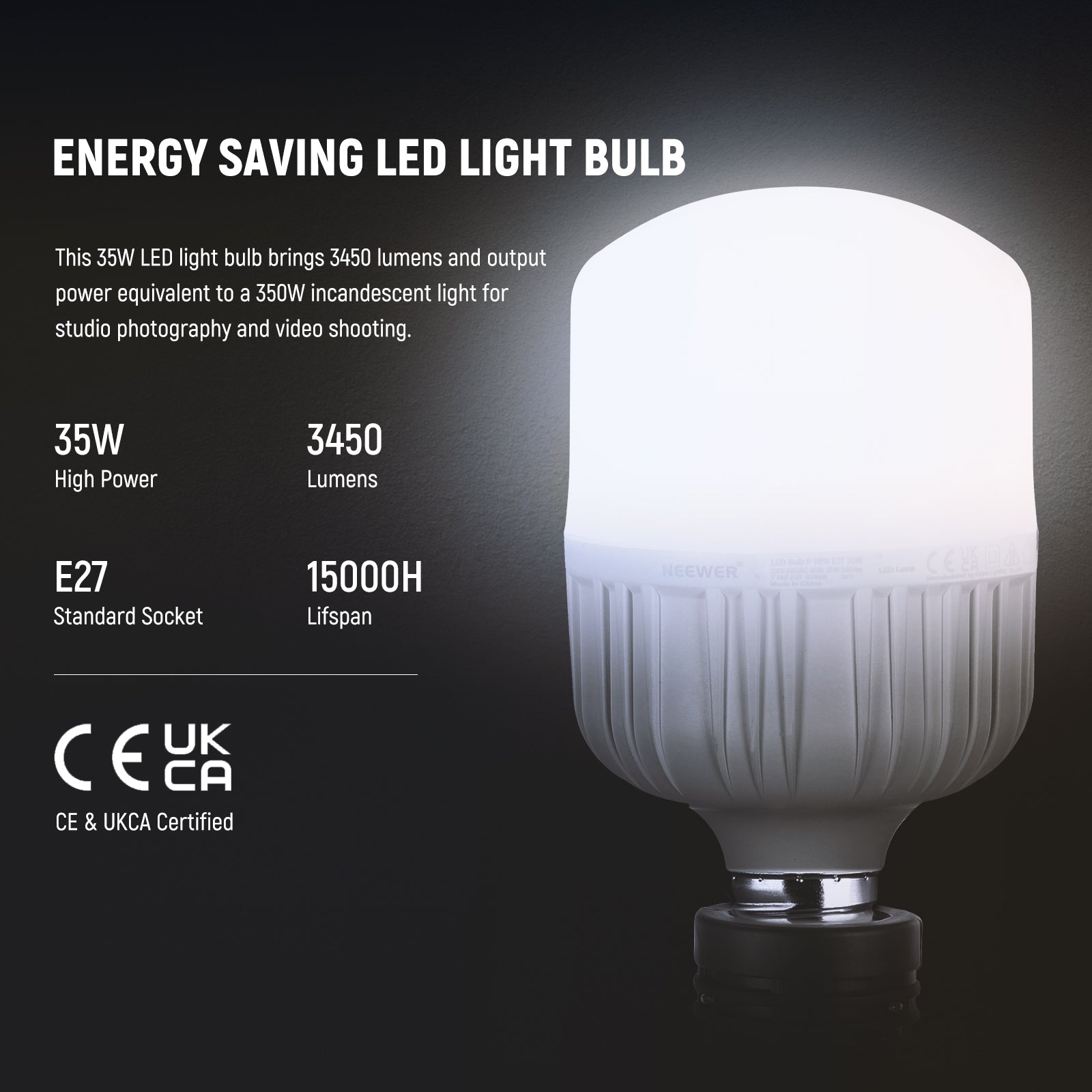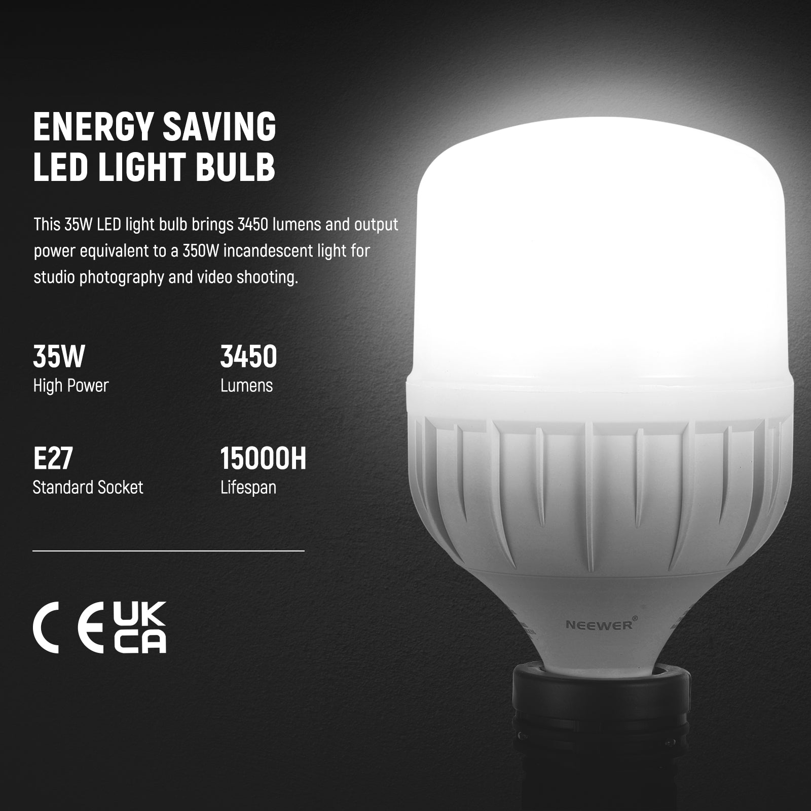 - Esta bombilla LED de 35 W con certificación UL tiene una potencia de salida equivalente a una luz incandescente de 350 W y brinda 3150 lúmenes para fotografía de estudio y grabación de videos.