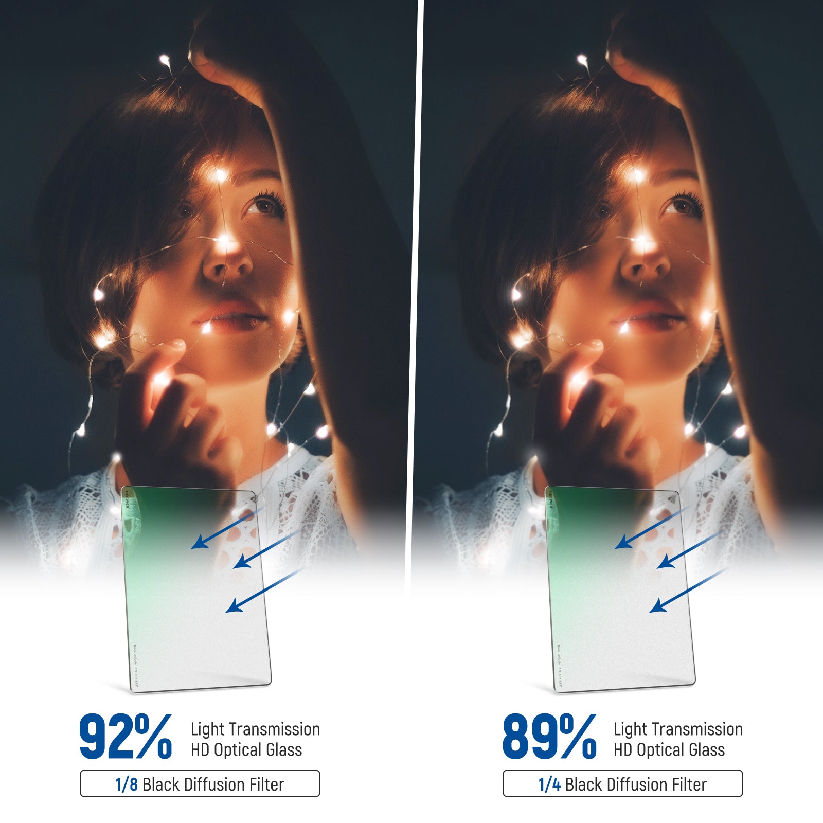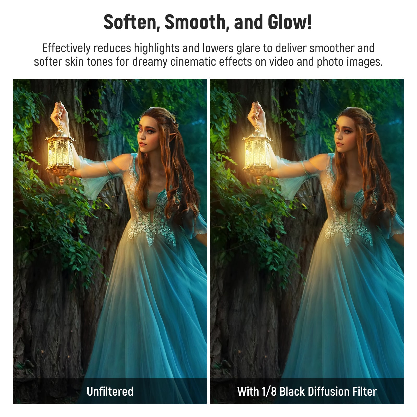 - Filtro de difusión de negro de 1/8 para efecto cinematográfico : el filtro de difusión de negro de 1/8 de paso reduce eficazmente las luces y reduce el brillo para ofrecer un tono de piel más suave y terso para un efecto cinematográfico de ensueño en imágenes de vídeo y fotografías. Ideal para fotografía de retratos, grabación de vídeo y vlogging