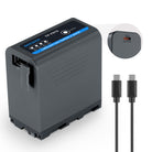 - Tiempo de carga completa de 4,8 horas con carga rápida PD de 20 W : esta batería recargable np-f970 cuenta con un puerto de entrada/salida USB tipo C bidireccional que admite una carga rápida PD de 20 W. ¡La carga completa de la batería solo lleva 4,8 horas a través de un cargador de pared! Se incluye un cable de carga rápida USB tipo C. El cargador de pared PD de 20 W NO está incluido