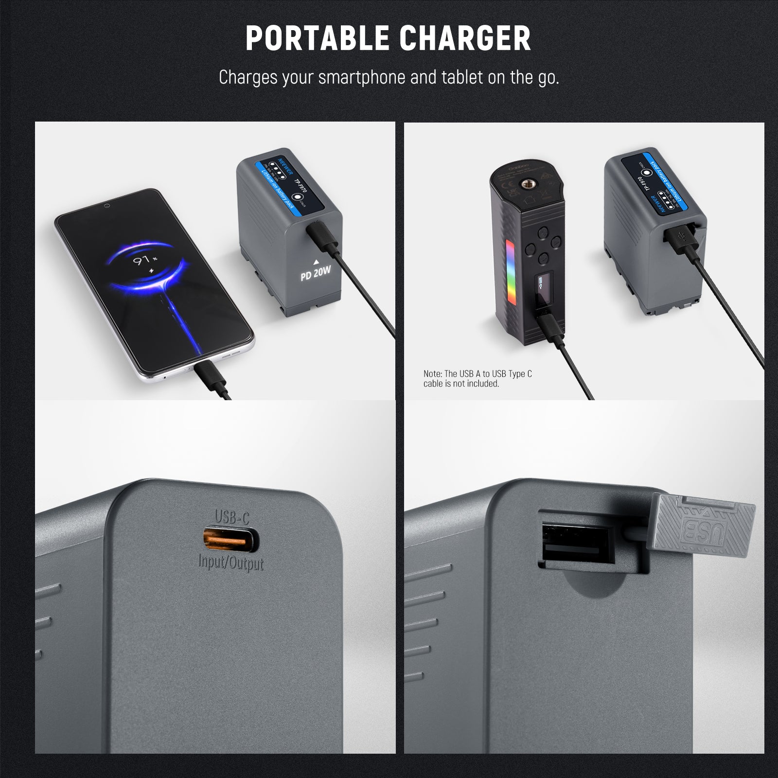 - Capacidad de 10500 mAh para una alimentación suficiente : esta batería de litio de repuesto npf con celdas de primera calidad, fabricada con una gran capacidad de 10500 mAh (7,2 V 76,34 Wh), garantiza una alimentación abundante para proyectos de fotografía y producciones de vídeo consistentes sin efectos de memoria. Es una fuente de alimentación portátil que respalda su dispositivo para capturar cada momento hermoso mientras viaja. Además, la batería nf970 también tiene un puerto USB A con salida de 5 V para cargar teléfonos inteligentes y tabletas.