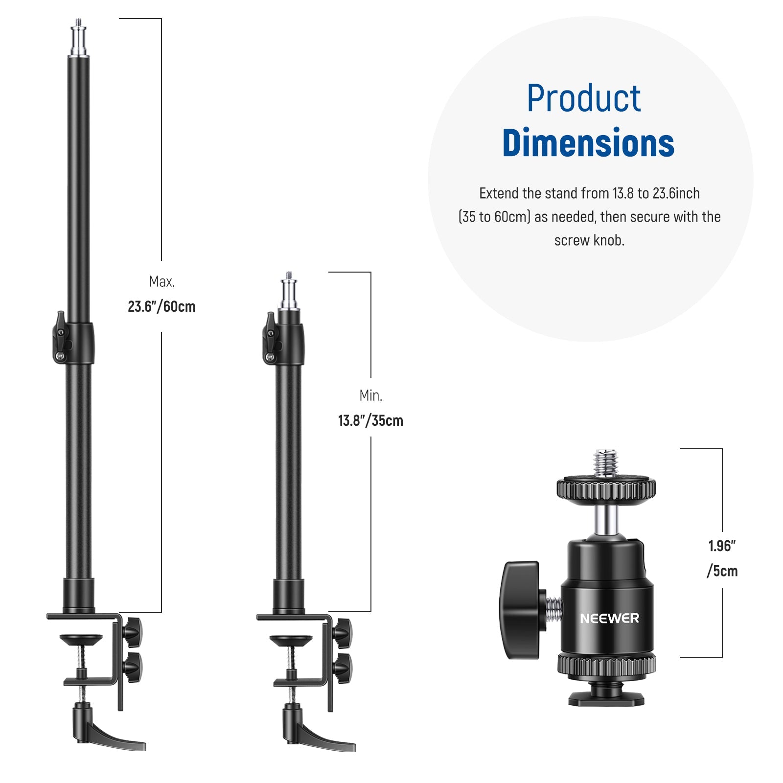 - Ajustable con perilla de bloqueo : ajuste la altura del soporte de 13,78”/35 cm a 23,62”/60 cm. El mini cabezal esférico garantiza una rotación horizontal de 360° para fotografías panorámicas y una inclinación de -90° a 90°. Utilice la perilla de bloqueo de la rótula para aflojar la rótula y ajustarla al ángulo deseado para satisfacer sus necesidades.