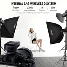 • Sistema Q inalámbrico 2.4G y modos S1/S2 : construido con el sistema Q inalámbrico 2.4G, S101-300W PRO puede funcionar con el disparador 2.4G y permitir sincronización de alta velocidad de 1/200s dentro de 100 pies/30 m cuando se configura en el mismo canal de 16 canales disponibles. S101-300W PRO también funciona con QPRO Trigger (se vende por separado) para una sincronización más rápida y mejores capacidades antiinterferencias gracias a 1-99 ID inalámbricas y 32 canales. Puede ser activado por una unidad maestra manual en el modo S1 y una unidad maestra TTL en el modo S2.