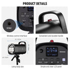 - Disipación de calor eficiente y silenciosa : el sistema de disipación de calor recientemente actualizado adopta un ventilador de enfriamiento silencioso y radiadores superiores para disminuir efectivamente la temperatura de funcionamiento en la fotografía con flash de estudio, prolongar la vida útil de la monoluz, crear un ambiente de disparo silencioso y evitar el sobrecalentamiento incluso después de 260 continuos de potencia máxima. parpadea