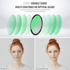 - Nanorrecubrimientos de 30 capas : las 30 capas de nanorrecubrimientos en ambos lados de los filtros los hacen impermeables, resistentes a los rayones y al aceite, para reducir eficazmente el reflejo proveniente de todas las direcciones y del propio filtro.