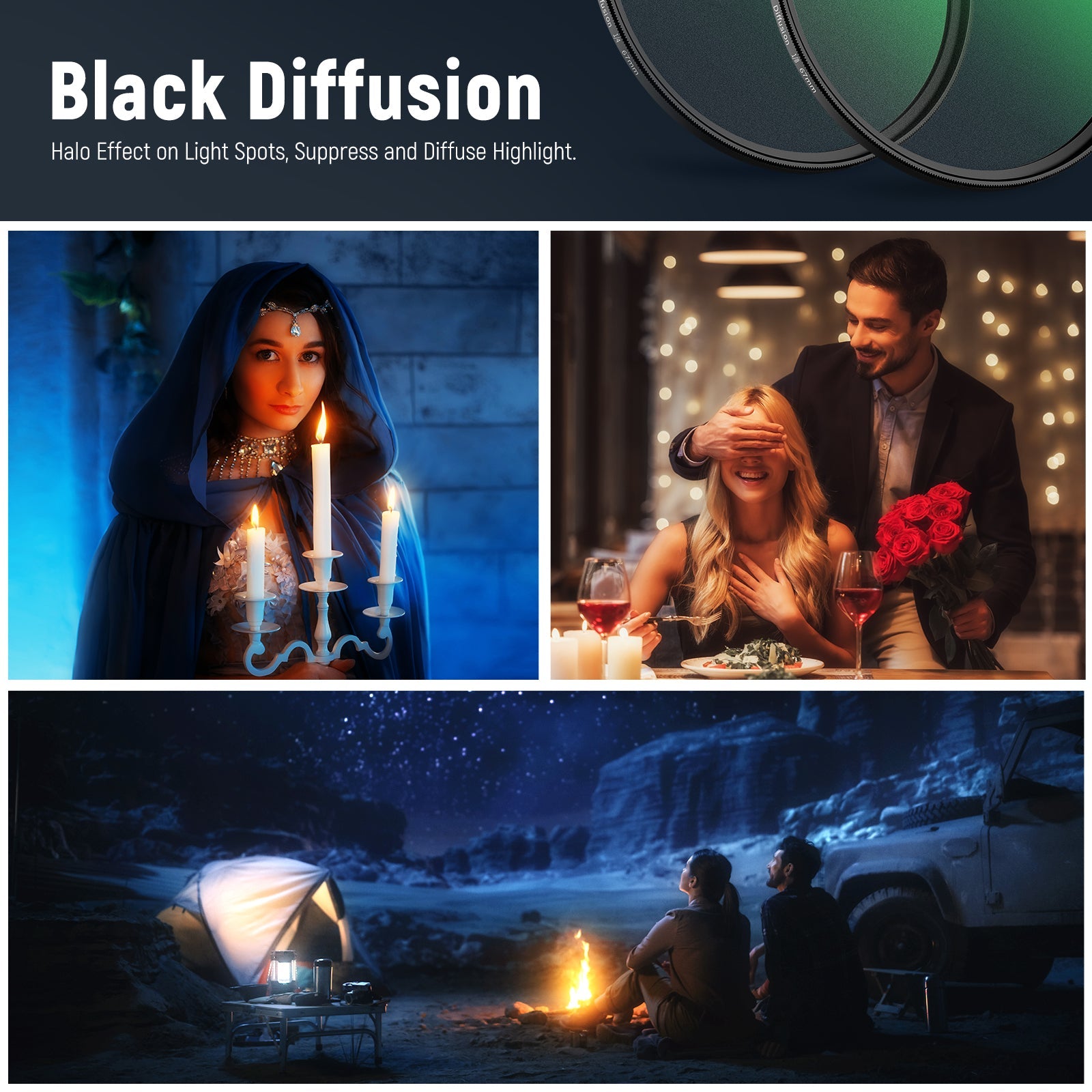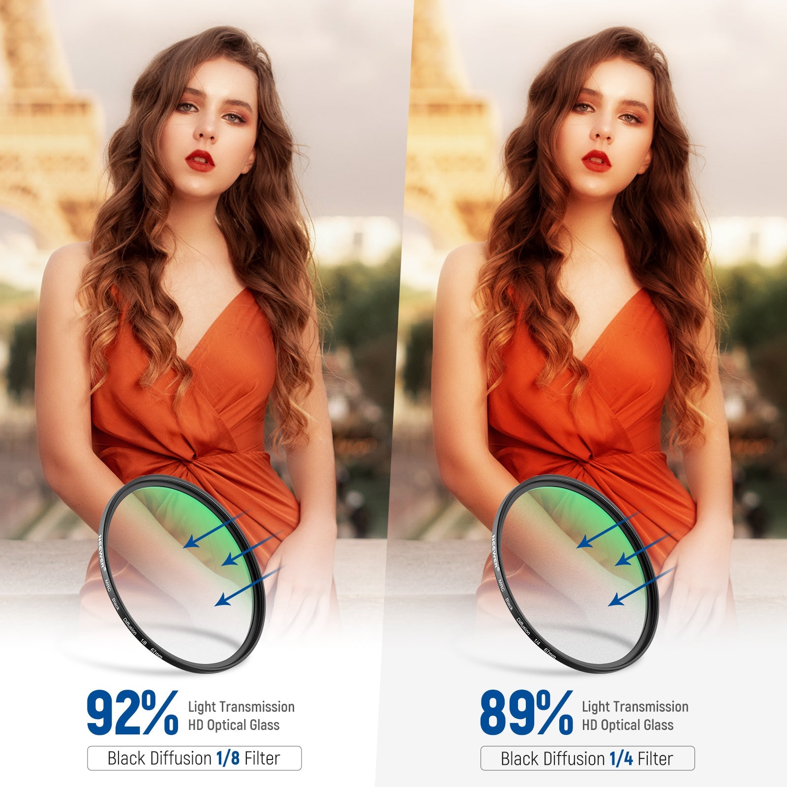 - Vidrio óptico HD : hecho de vidrio óptico HD de última generación con transmisión de luz superior, 49/55/58/67/77/82 mm. Los filtros de lentes reducen el contraste, suavizan las arrugas y los poros de la piel y proporcionan un halo práctico y aumentado que agrega una profundidad agradable y cálida a la imagen.