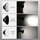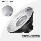 - Reflejo de luz premium : el reflector Beauty Dish primero hace rebotar la iluminación hacia atrás con la placa deflectora, luego la llena dentro del plato y finalmente proyecta un haz amplio y uniforme. Crea una luz enfocada, pero suave y uniforme, que resalta los rasgos faciales del sujeto y minimiza las sombras marcadas. Los interiores plateados mejoran la intensidad de la luz y conservan la reproducción de colores neutros.