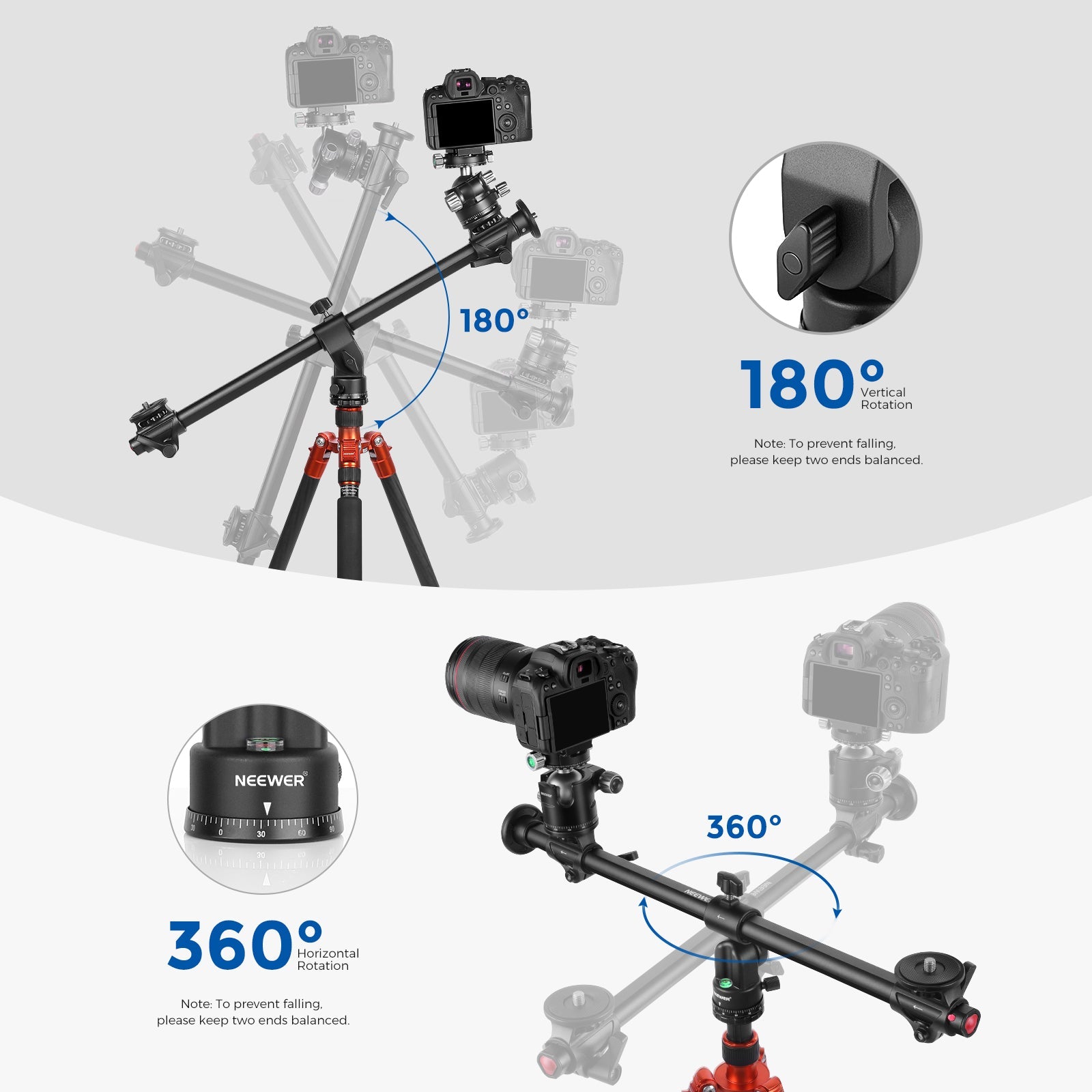 - Combinación múltiple : con 3 cabezales de montaje en total, se puede ajustar 360° horizontalmente y 180° verticalmente para satisfacer sus diversas necesidades diarias de disparo. Le permite instalar varias cámaras, luces u otros equipos fotográficos al mismo tiempo. (Nota: mantenga el equipo del mismo tamaño/peso para permitir el equilibrio)