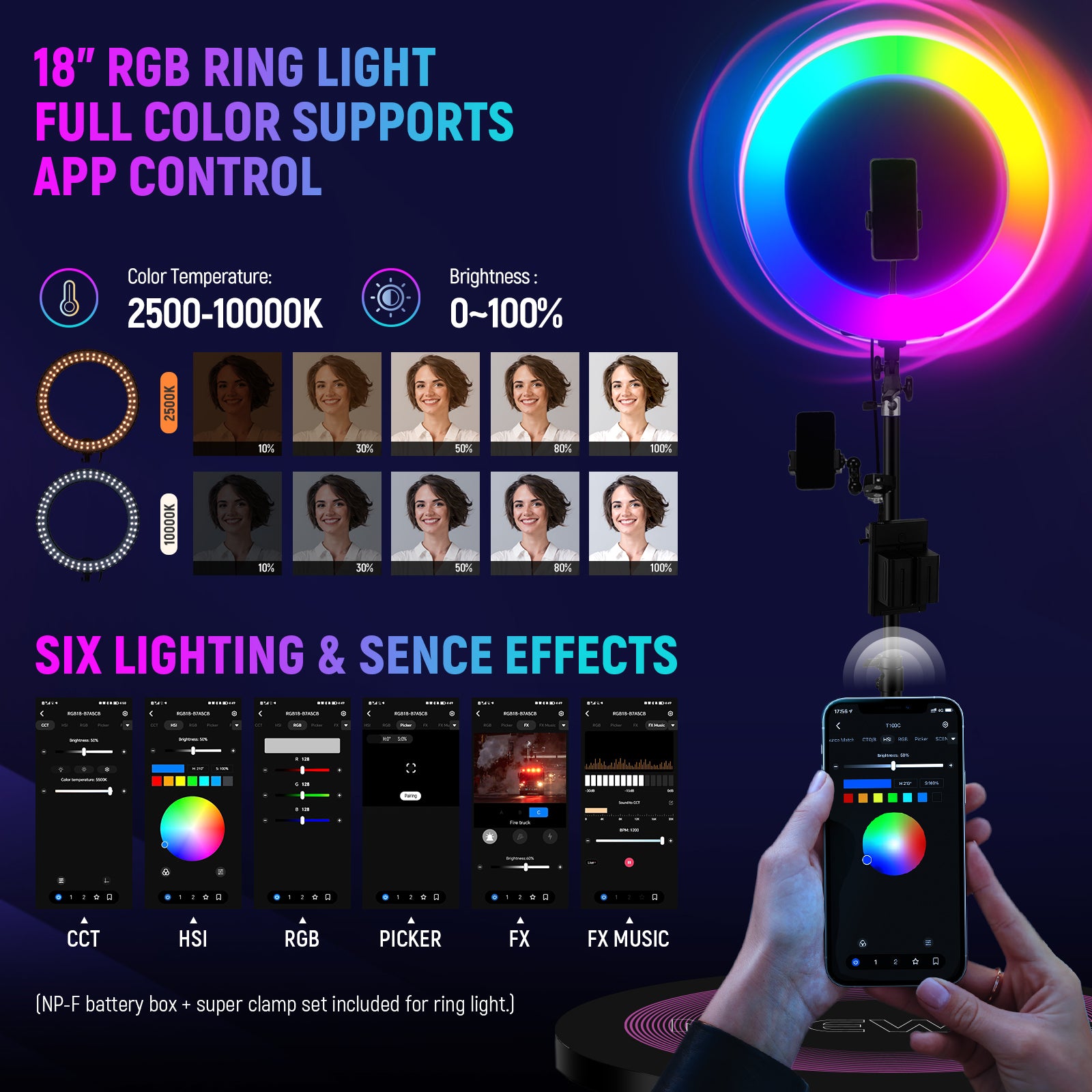 - Anillo de luz RGB de 18" - El NEEWER RGB18 (II) ofrece una excelente luz a todo color de 360° con inclinación ajustable de 180°. Ofrece seis modos de atenuación, incluyendo CCT/HSI/RGB/Picker/FX/FX Music, y admite efectos de luz de escena preestablecidos que se sincronizan con la música. Con un rango de temperatura de color ajustable de 2500K a 10000K y un alto CRI97+, es perfecto para iluminación de relleno para varias personas. El control remoto Bluetooth a través de la aplicación NEEWER facilita su uso.