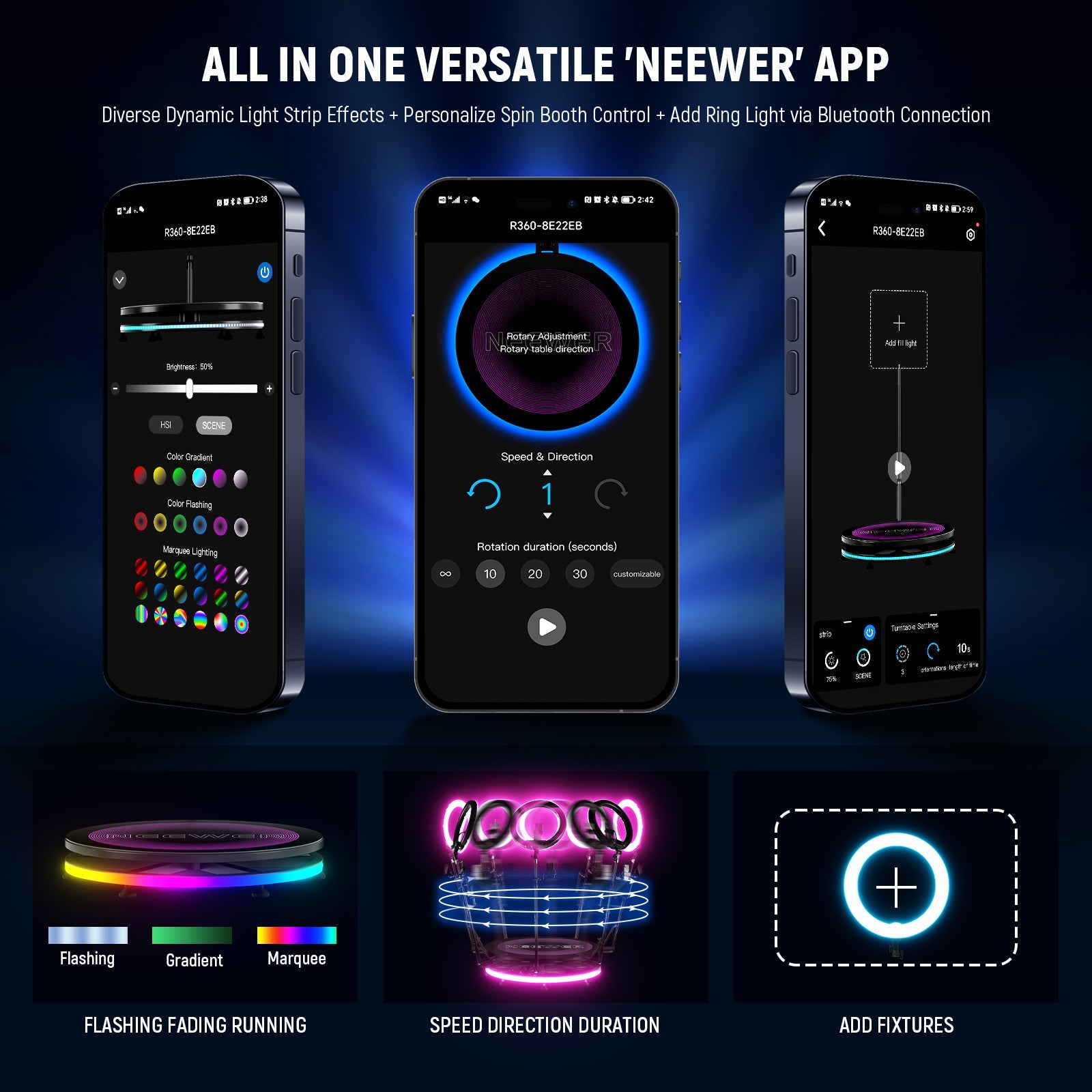 - Control inteligente mediante la aplicación : Descarga la aplicación "NEEWER" y conéctala por Bluetooth al fotomatón NEEWER R360 y al aro de luz para disfrutar de más funciones. Controla fácilmente los efectos de la tira de luz, las 36 000 combinaciones de colores de luz HSI y los 30 efectos de luz predefinidos. Personaliza la configuración de rotación en tu teléfono: selecciona la dirección de rotación, la velocidad y el tiempo de rotación para lograr diversos efectos de disparo.