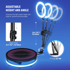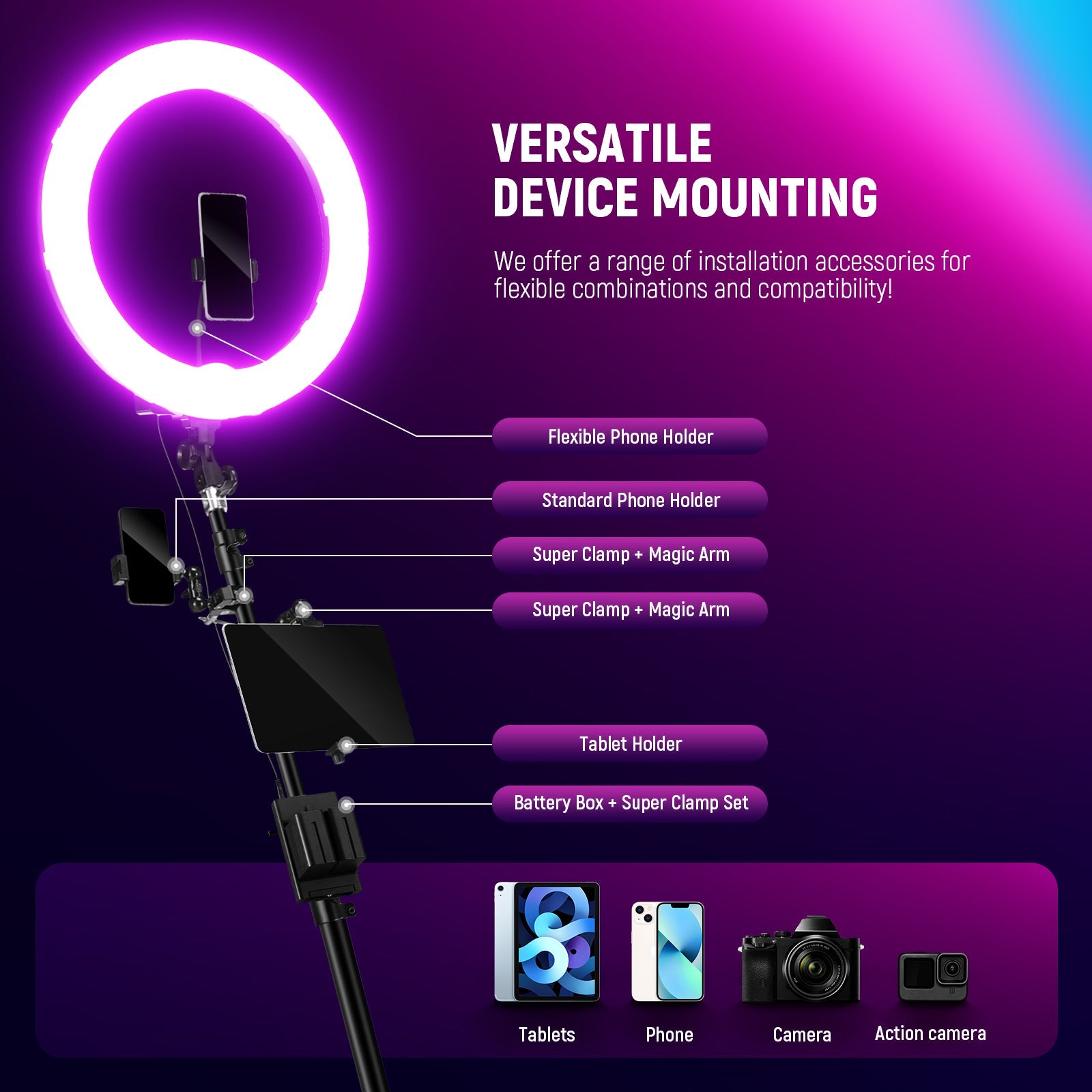- Altura flexible y montaje multidispositivo : La altura del soporte de luz se ajusta en tres secciones (62-200 cm) y permite ajustar el ángulo frontal y posterior. Junto con la inclinación de 180° del aro de luz, permite grabar desde múltiples ángulos sin esfuerzo. Usa accesorios como los soportes para teléfono/tableta y las superabrazaderas incluidos para grabar simultáneamente con varios dispositivos durante videos cortos, transmisiones en vivo y creación de contenido.