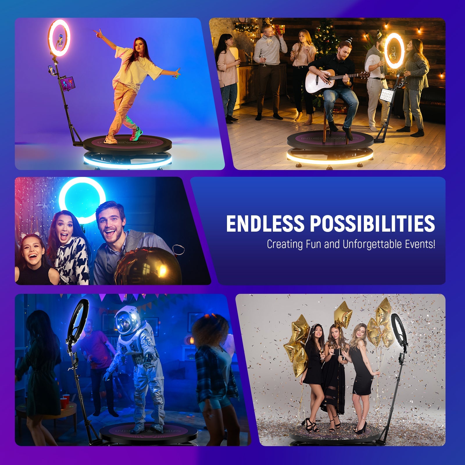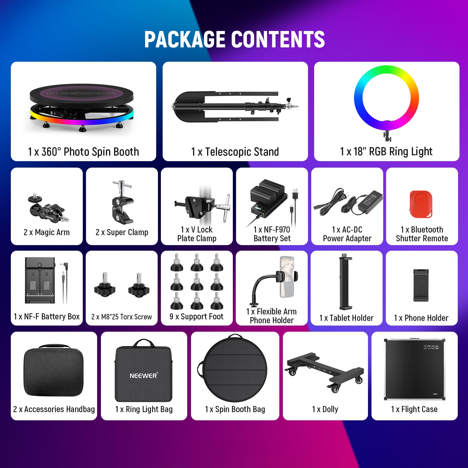 - Fotomatón panorámico de 360° para selfies : Presentamos el kit de fotomatón NEEWER 360, una solución integral para creadores de contenido y streamers de YouTube/TikTok. Combina un trípode giratorio de 360° de 100 cm (cubierta de imagen personalizable), una tira LED RGB, un anillo de luz RGB de 18" con control por aplicación y varios accesorios compatibles con múltiples dispositivos. Ideal para fotos de 360°, cámara lenta HD, GIF y videos de 1 a 3 personas u objetos, llevando tus proyectos artísticos y comerciales al siguiente nivel.