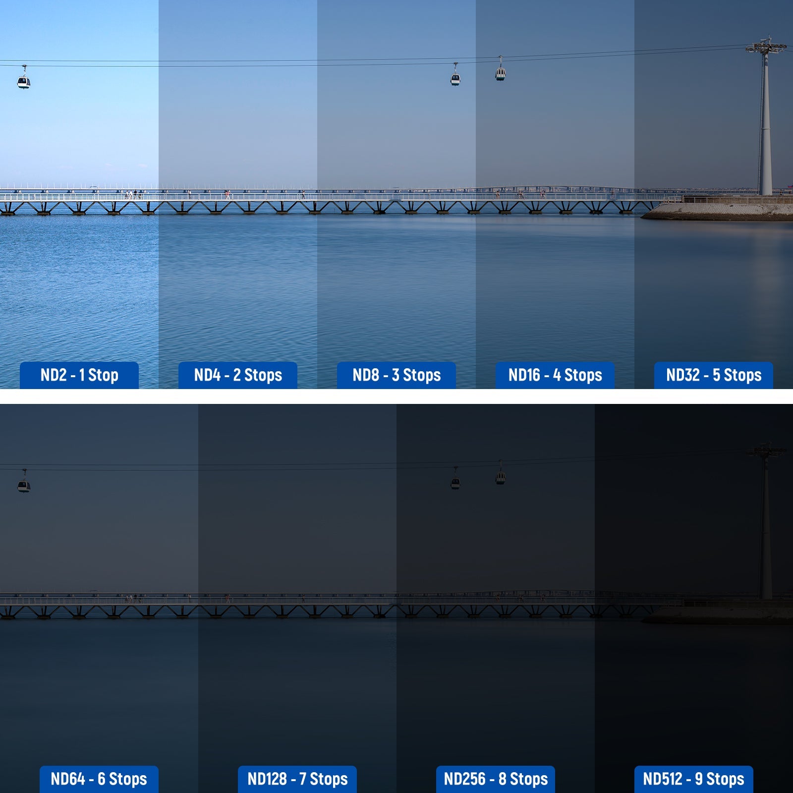 - Control flexible de exposición equilibrada : El filtro ND2-32 ajustable, con una reducción de luz de 1 a 5 pasos, es ideal para condiciones de iluminación moderada, lo que permite velocidades de obturación más lentas y aperturas más amplias. El filtro ND64-512 ajustable, con una reducción de luz de 6 a 9 pasos, es más apropiado para situaciones de mucha luz. Permite velocidades de obturación más largas, incluso con luz intensa, lo que ofrece efectos creativos como cascadas suaves o movimiento desenfocado.