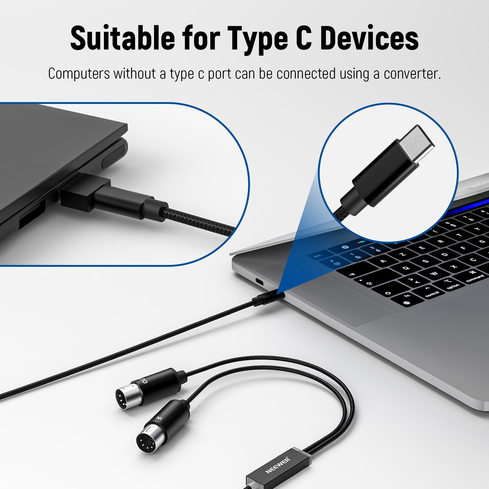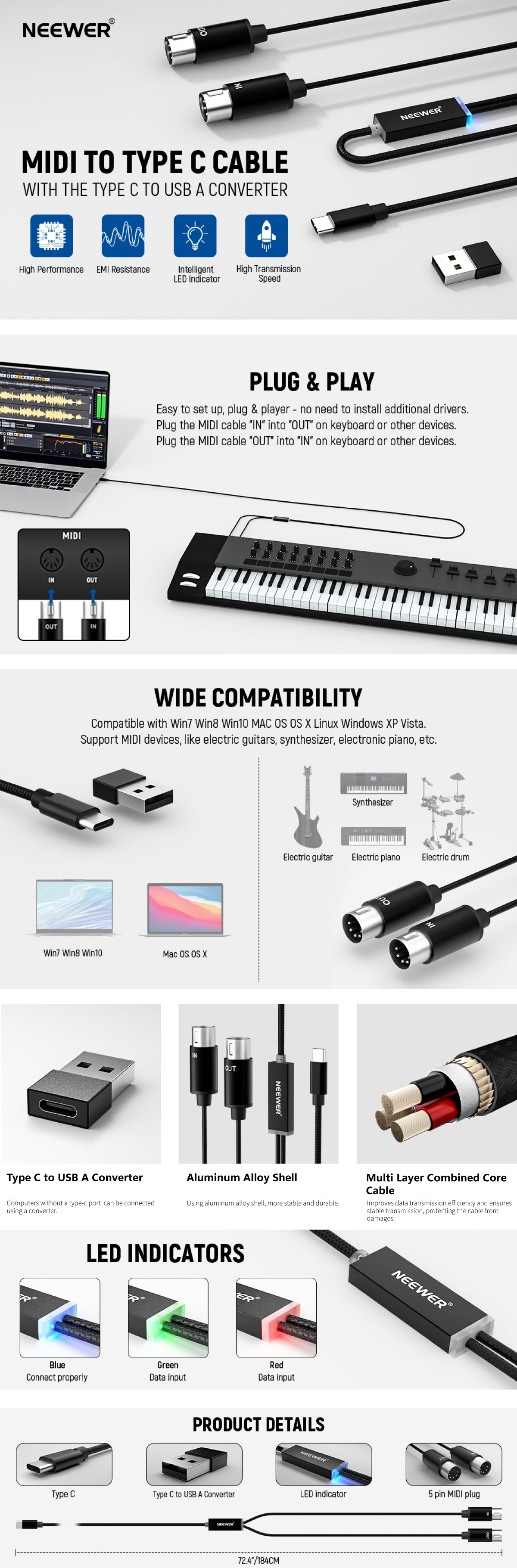NEEWER Cable MIDI a Tipo C de 72,4"/184 cm