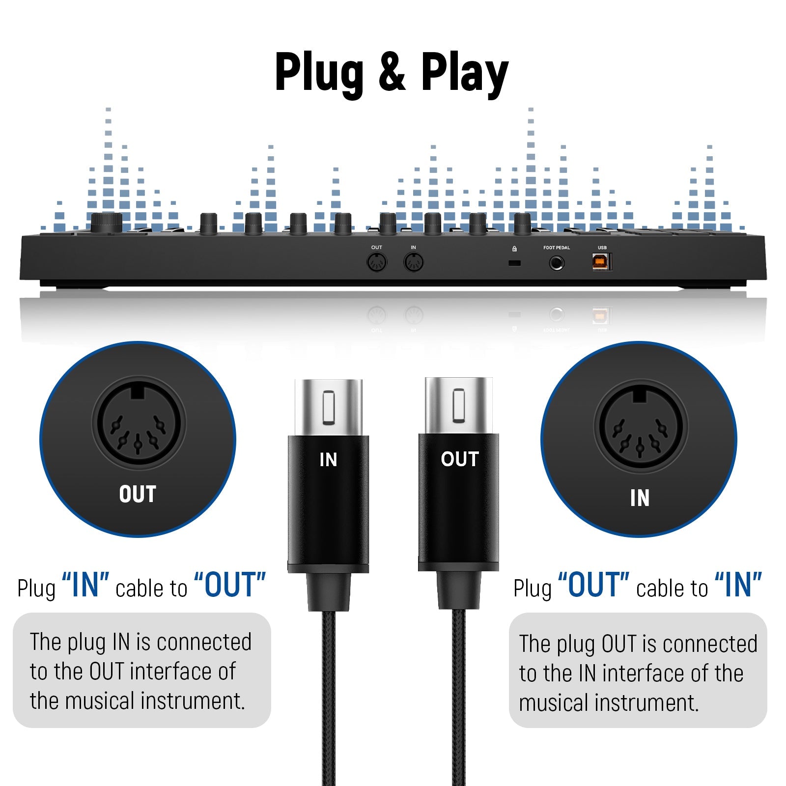 - Transmisión rápida y estable: entrada y salida MIDI de latencia ultrabaja. Equipado con una fuerte conductividad eléctrica, el cable MIDI permite una transmisión suave y estable y brinda protección contra interferencias electromagnéticas.
