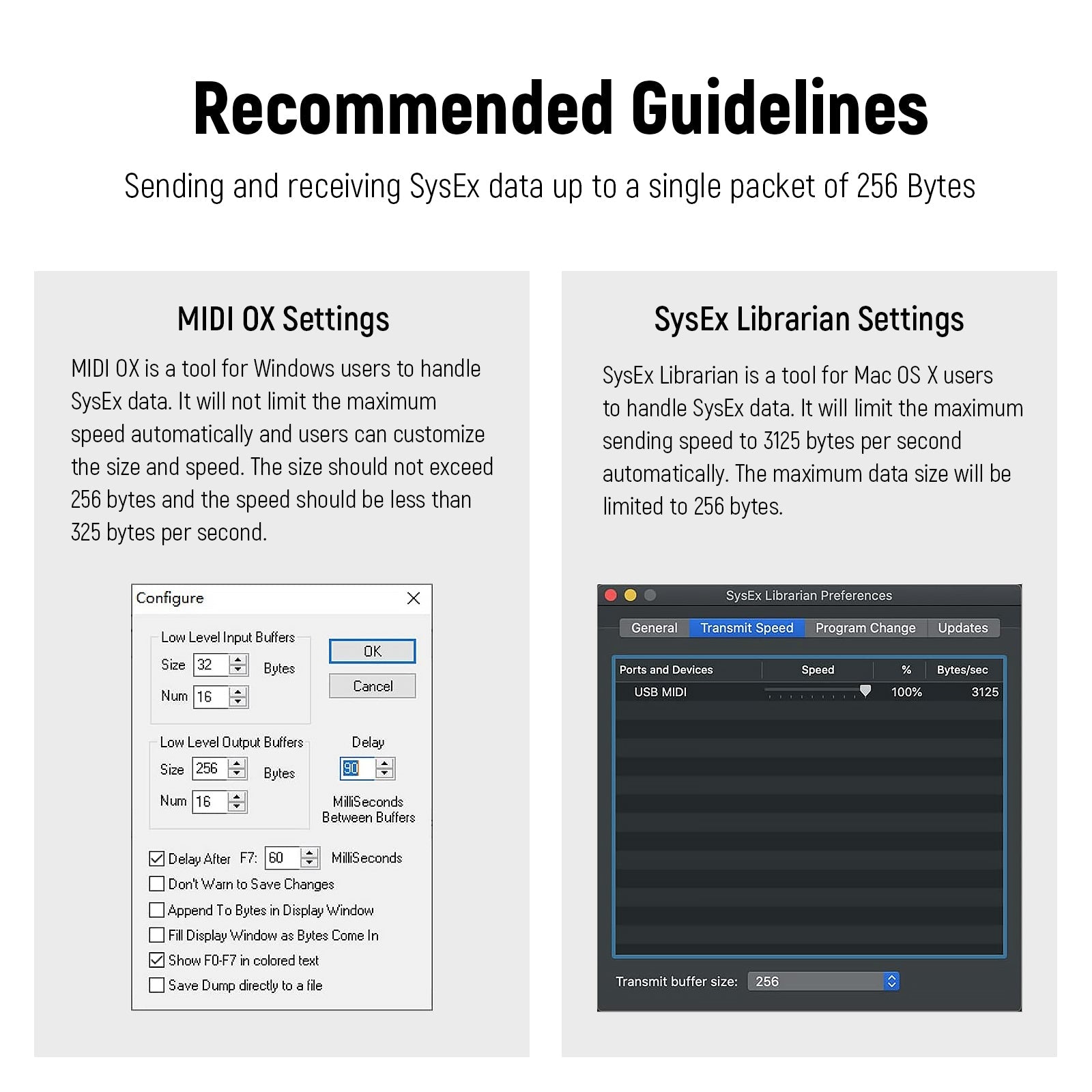 - No envíe datos SysEx a una velocidad superior a la velocidad máxima del protocolo MIDI (3125 bytes por segundo), porque el ancho de banda del USB es mucho mayor que eso. Si se van a enviar 256 bytes de datos, se recomienda un retraso superior a 90 ms.