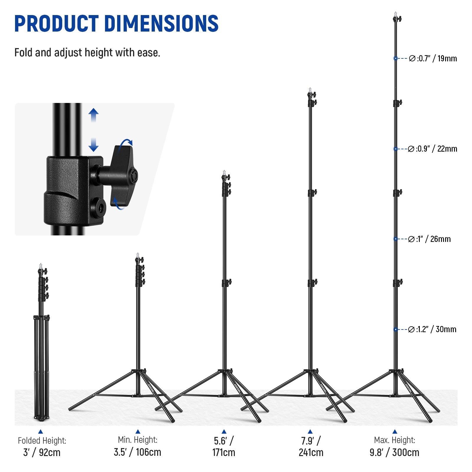 - Ajuste de altura sencillo: eleve la columna central telescópica de 4 secciones de 106 cm a 300 cm (3,5 pies a 9,8 pies) y fíjela con las perillas de metal para lograr una fuerza de bloqueo excepcional. El amplio rango de altura permite una colocación flexible del dispositivo, mientras que el diseño plegable facilita el transporte y el almacenamiento.