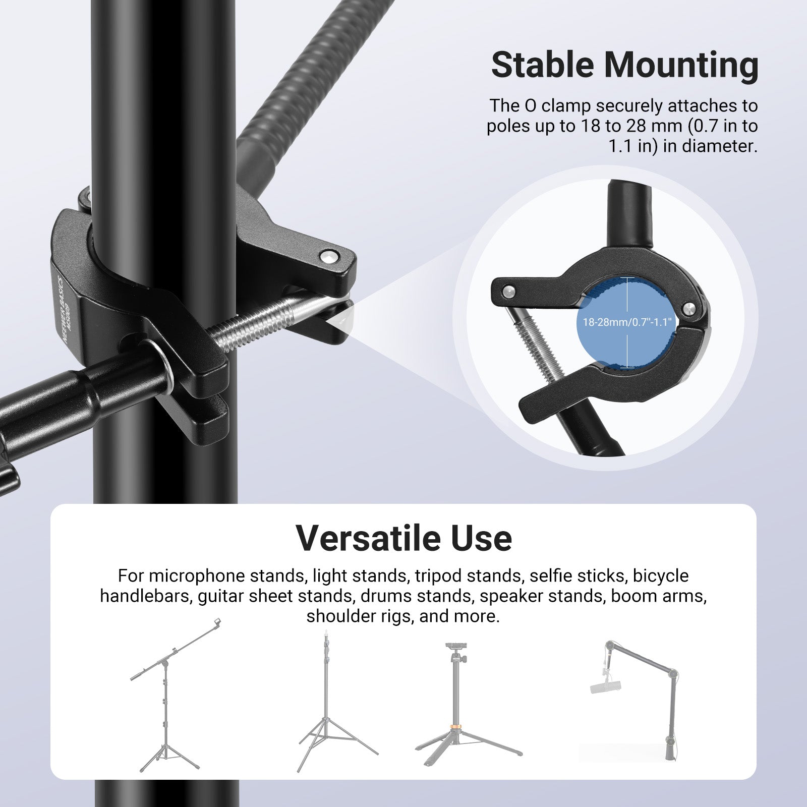 - Montaje estable y uso versátil : se sujeta de forma segura a un poste de hasta 0,7" a 1,1" (18 a 28 mm) de diámetro, la abrazadera tipo O es para soportes de micrófono, soportes de iluminación, soportes de trípode, palos de selfie, manillares de bicicleta, soportes de partituras de guitarra, soportes de batería, soportes de parlantes, brazos articulados, plataformas de hombro y más