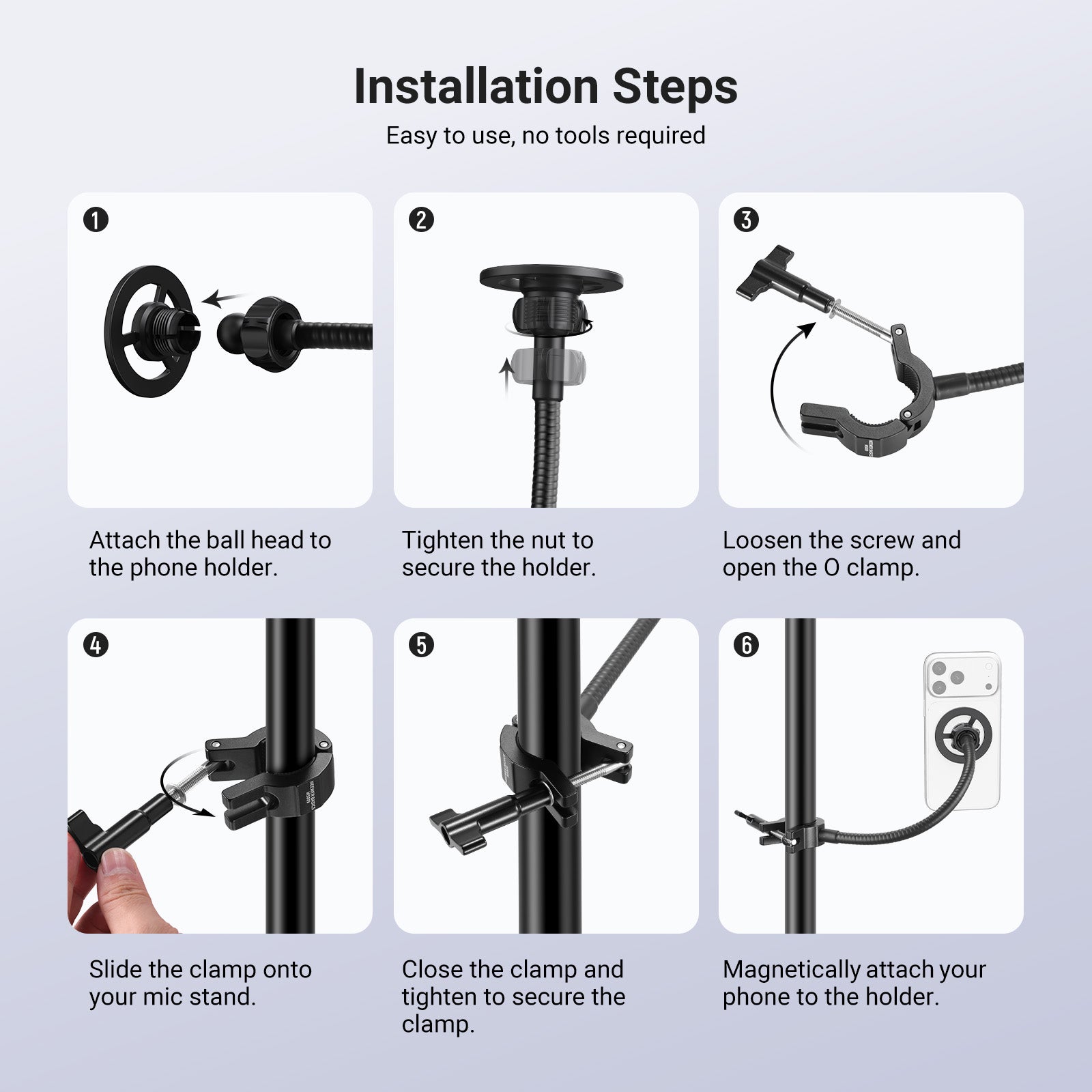 - Soporte para teléfono con brazo flexible : Este soporte para micrófono cuenta con un brazo flexible y una abrazadera tipo O, fabricados en robusta aleación de aluminio, para fijar el teléfono al soporte con firmeza y una excelente estabilidad. Su tubo flexible y su rótula metálica permiten ajustes suaves, mientras que el soporte sujeta firmemente el dispositivo, ideal para vlogs, transmisiones en vivo, grabación de audio y video, podcasts y más.
