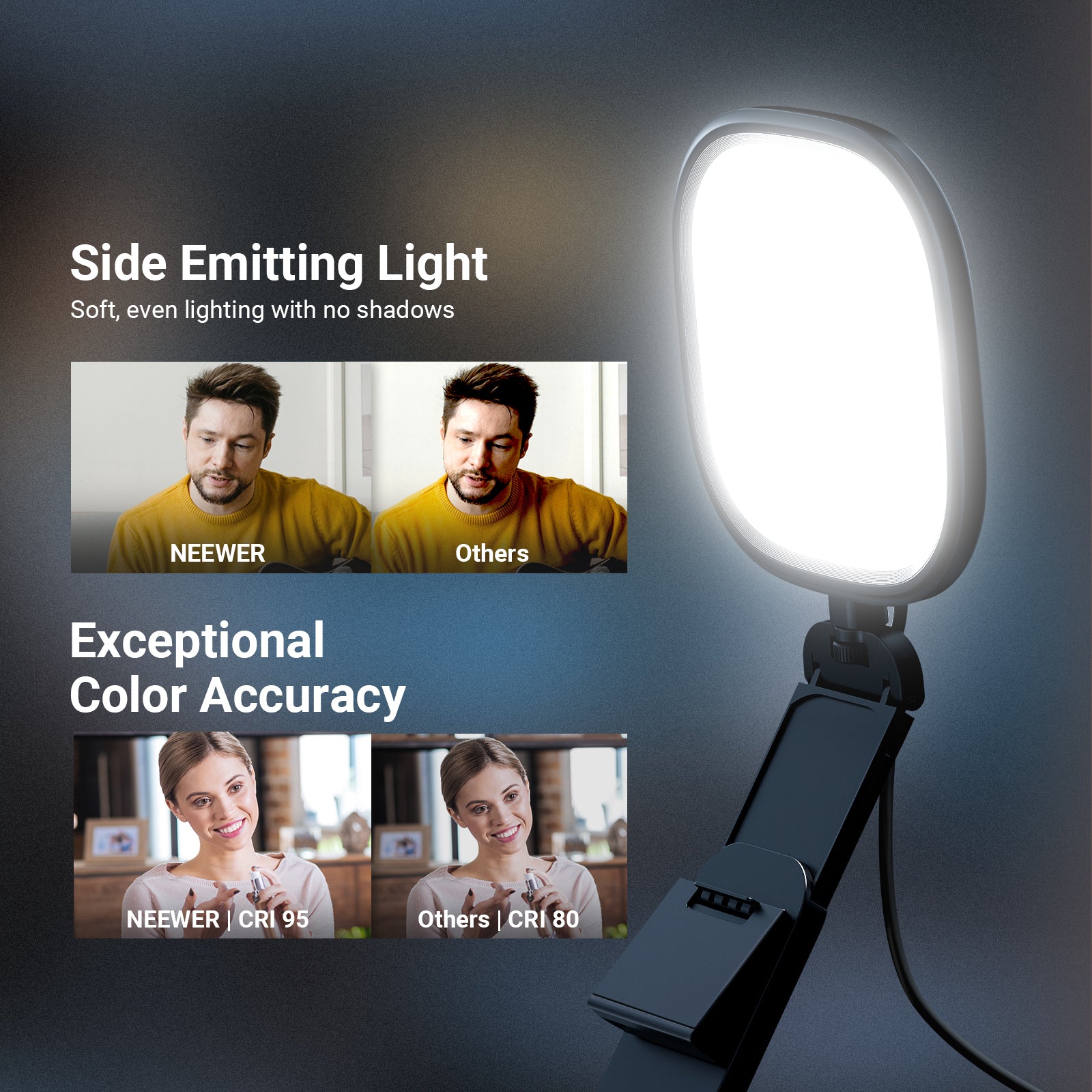 - Luz ajustable : la luz para monitor NEEWER NL10 está equipada con 120 LED bicolor de hasta 656 lux/0,5 m, con 5 modos CCT y 10 niveles de brillo para favorecer cualquier tono de piel y adaptarse a diversas necesidades de iluminación de vídeo de escritorio. La función de memoria recupera automáticamente la última configuración de temperatura de color y brillo utilizada. Incluye un adaptador USB A a USB C.