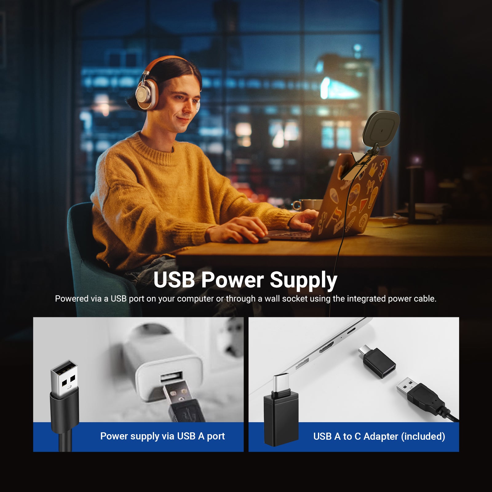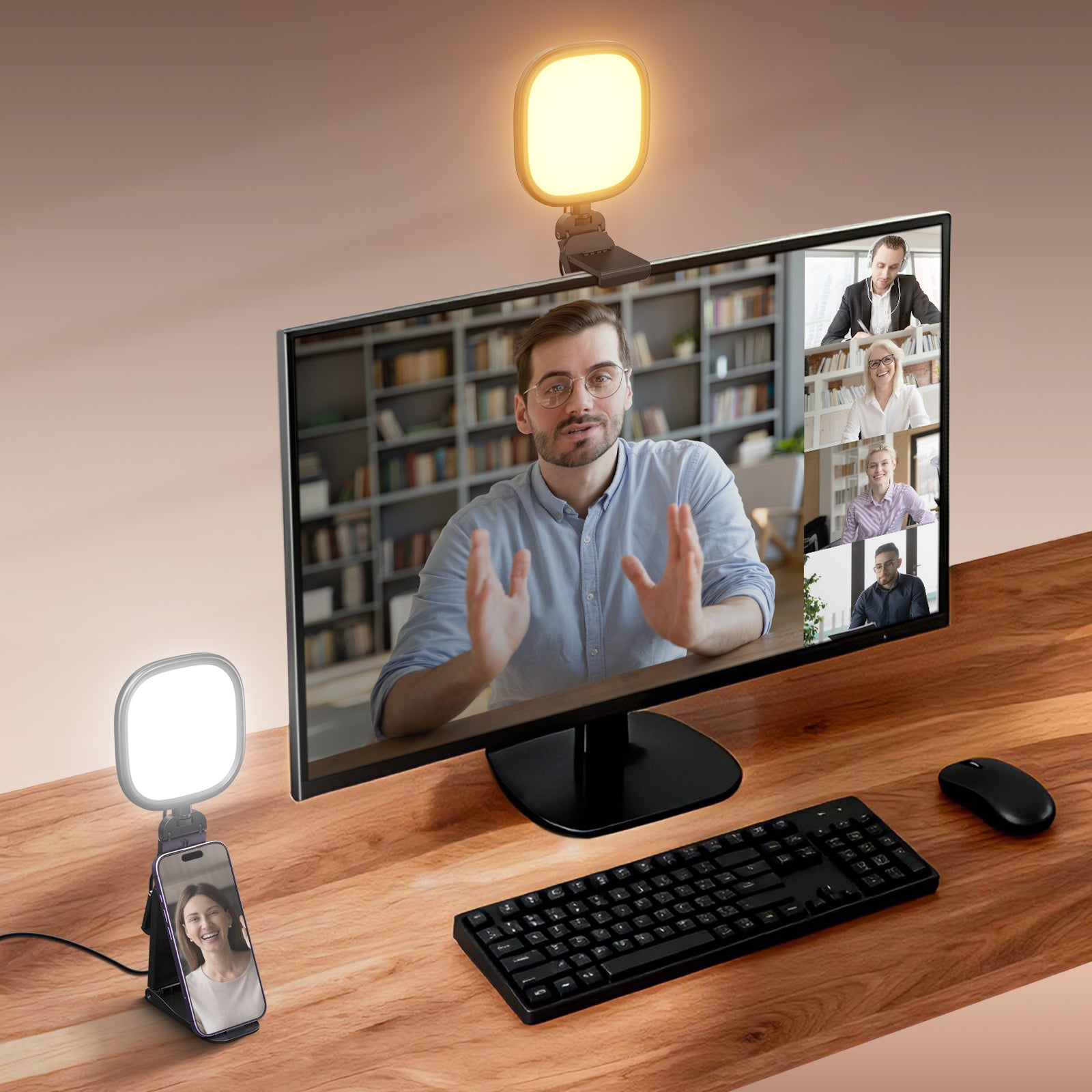 - Luz versátil de pantalla completa : Instale la pequeña luz LED de panel con soporte directamente en un monitor, monitor curvo, portátil, pantalla de ordenador o colóquela en el escritorio como accesorio de escritorio. Conéctela a una cámara web mediante el orificio roscado de 1/4". Iluminación portátil para grabar TikTok, YouTube, podcasts, videoconferencias, reuniones/llamadas de Zoom, streaming de videojuegos, clases online, selfies, grabación de maquillaje, lectura, etc. Se alimenta mediante un puerto USB con el cable de alimentación integrado de 193 cm.