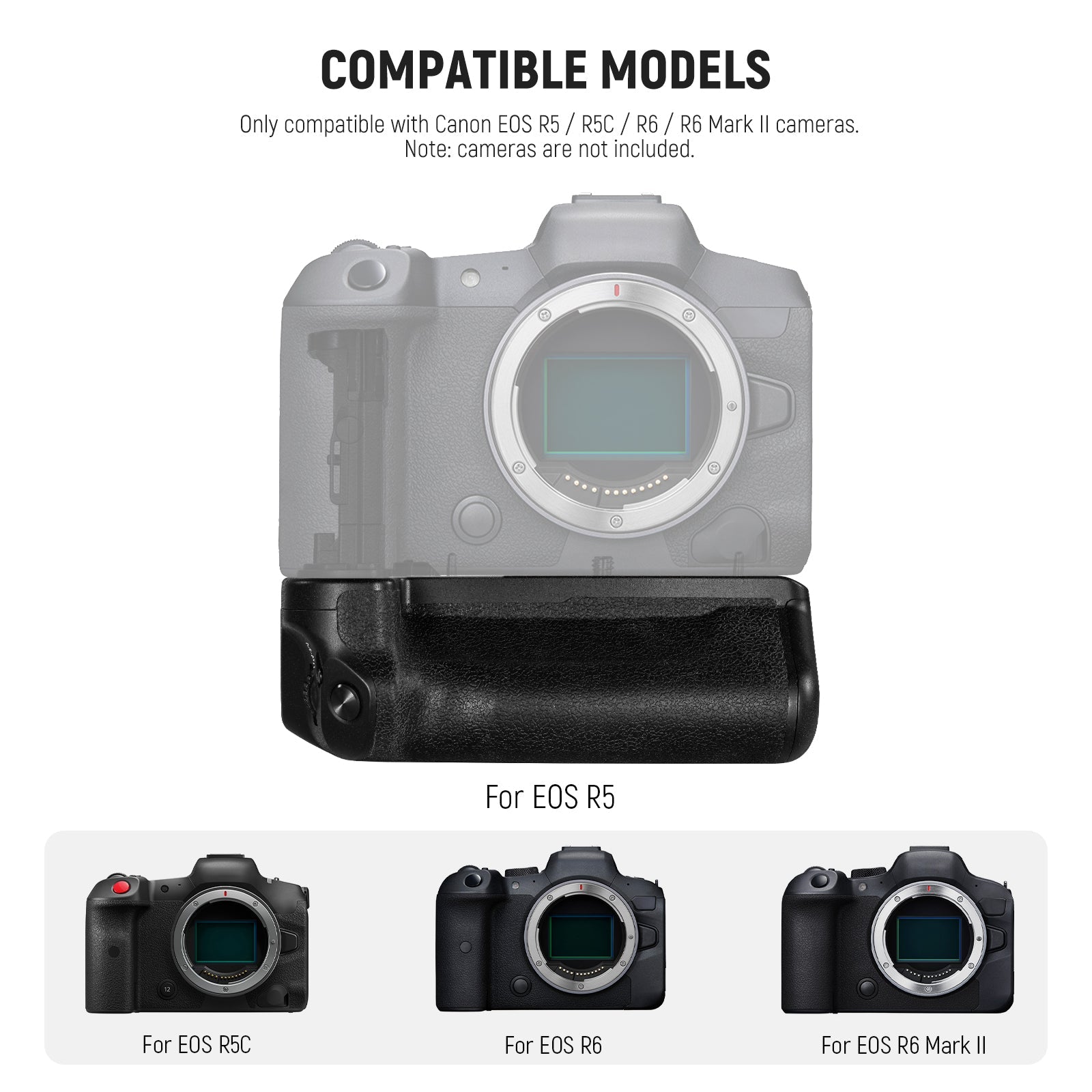- Compatibilidad del modelo : la empuñadura de batería NEEWER BG-R10 es compatible con las cámaras Canon EOS R5 R5C R6 R6 Mark II para obtener imágenes/vídeos nítidos en orientaciones verticales y más energía de la batería.