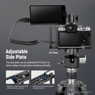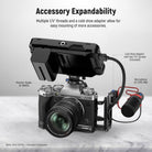 - Placa lateral extensible : la placa lateral se puede extender 23 mm para agregar flexibilidad y más espacio para que pasen los cables, especialmente al disparar verticalmente, y los orificios roscados de 5 x 1/4" brindan opciones de montaje adicionales, como el adaptador de zapata fría desmontable incluido para construir aún más. tu equipo de cámara