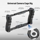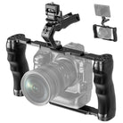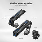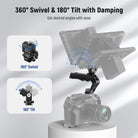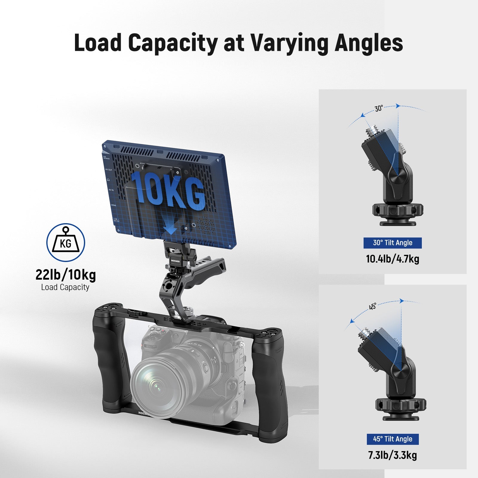 • Asa superior y soporte para monitor : El asa superior se fija firmemente a la jaula de la cámara mediante un tornillo de 3/8" con pasadores de posicionamiento ARRI y cuenta con un agarre de silicona contorneado para una grabación estable a pulso. El soporte para monitor, compatible con Atmos Ninja V y otros monitores de campo de 5" a 7" con rosca de 1/4", se conecta al asa superior mediante la zapata fría y permite un giro de 360° y una inclinación de 180° para ajustar el ángulo.