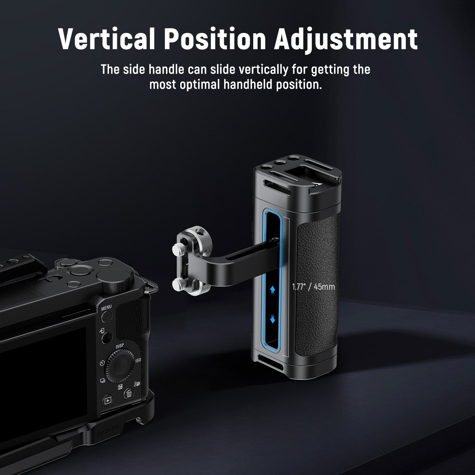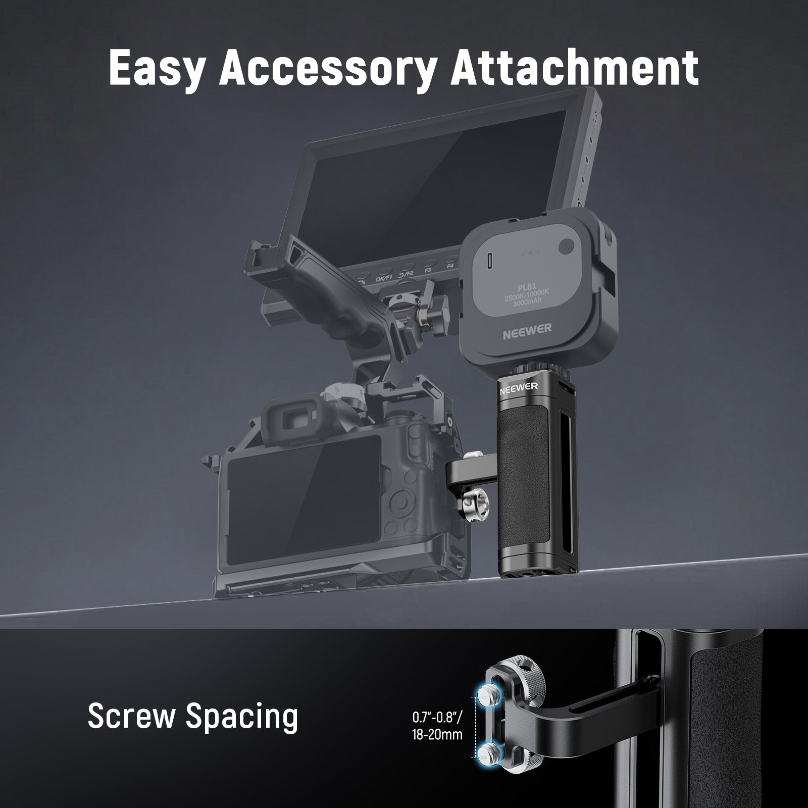 - Mango lateral universal liviano : este mango lateral compacto y liviano se conecta a la jaula de su cámara o equipo de video mediante dos tornillos de mariposa de 1/4". Con espacio entre tornillos ajustable de 0,7"-0,8" (18-20 mm), es compatible con jaulas SmallRig y NEEWER jaulas para cámaras (CA020 CA019 CA014 CA011 CA002) y le ayuda a estabilizar una cámara DSLR o sin espejo de hasta 33 lb/15 kg (no compatible con Tilta)
