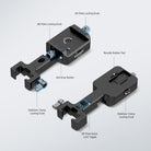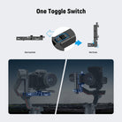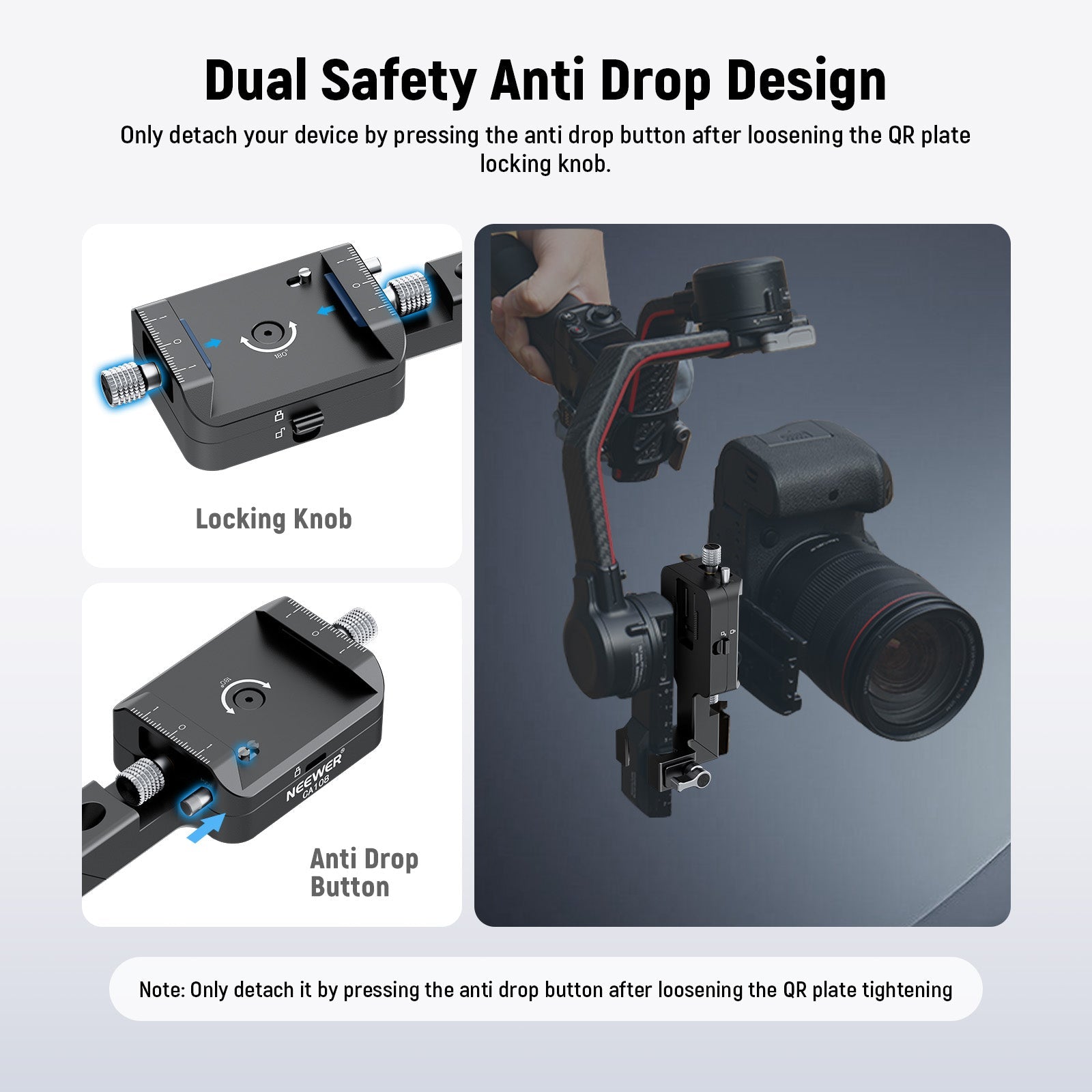 - Diseño de doble seguridad anticaídas : asegure su cámara u otros dispositivos al estabilizador con dos perillas de ajuste para la placa de liberación rápida y la abrazadera del estabilizador, y un bloqueo de palanca para la base de liberación rápida giratoria de 180°. El diseño de doble seguridad mantiene su dispositivo seguro, ya que solo puede separarlo presionando el botón anticaídas después de aflojar la perilla de ajuste de la placa de liberación rápida
