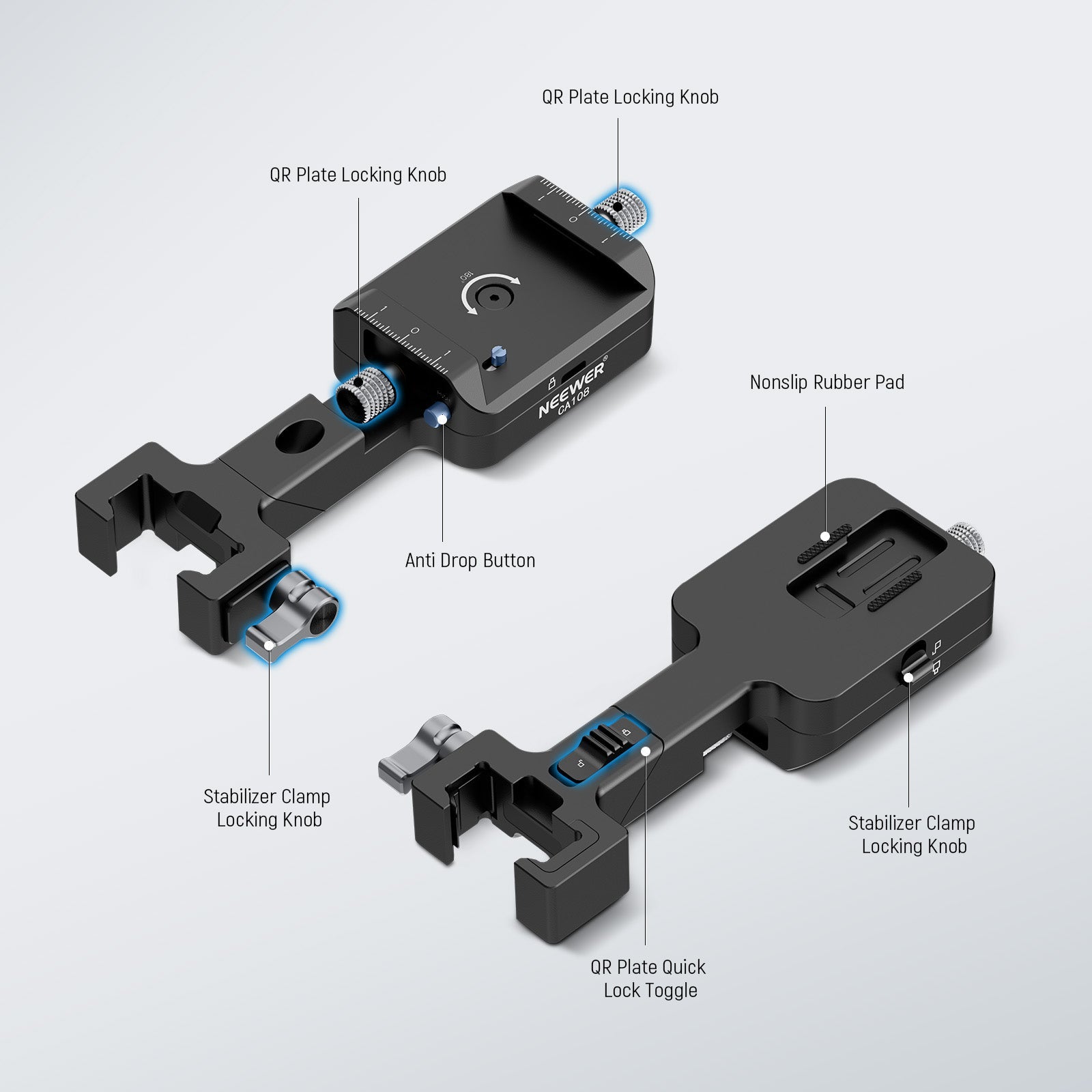 - Interruptor de palanca de un botón y base giratoria de 180° : cambia sin esfuerzo entre los modos horizontal y vertical con solo presionar un botón y bloquéalo fácilmente en su lugar alternando en la dirección opuesta. El equipo para cámara fotográfica NEEWER CA108 funciona perfectamente con la base giratoria de 180° de la abrazadera de liberación rápida para agregar flexibilidad para tomas manuales y empuja para bloquear la base en su lugar, perfecto para ángulos elevados, bajos, verticales, horizontales, etc.