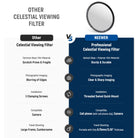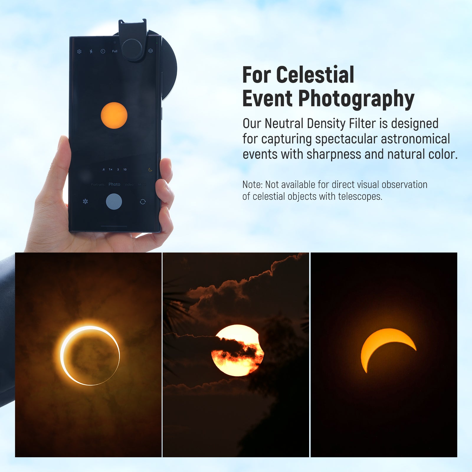 - Para fotografías celestiales impresionantes : nuestro filtro de densidad neutra con una densidad óptica de 3,8 está diseñado para capturar eventos astronómicos espectaculares con nitidez y color natural. Con este filtro, puedes fotografiar con seguridad las fases parciales y anulares de la luminaria, el magnífico efecto del anillo de diamantes y la totalidad etérea. Nota: No disponible para observación visual directa de objetos celestes con telescopios.