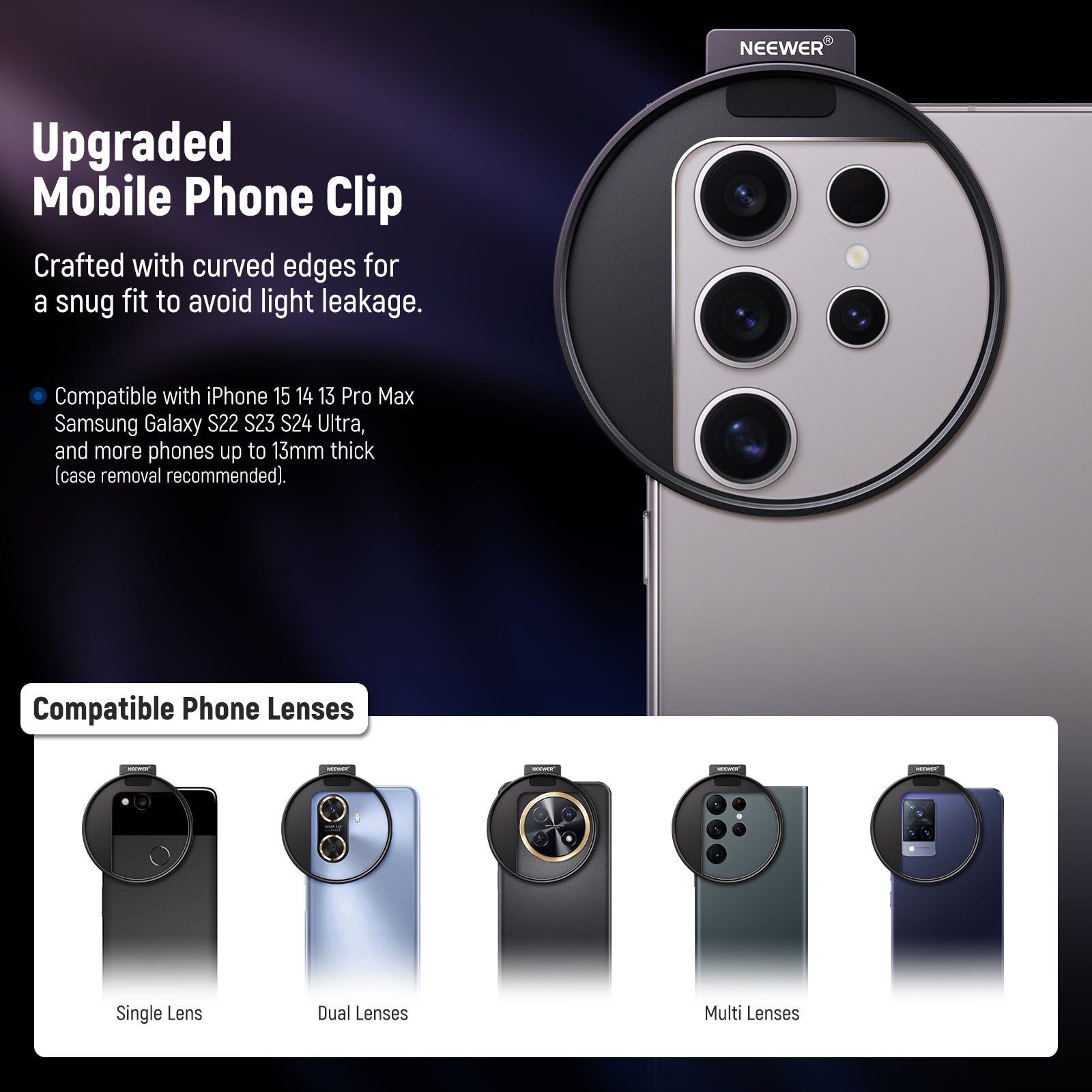 - Fácil de usar con amplia compatibilidad : el kit de filtro NEEWER Clip On de 67 mm convierte fácilmente la cámara de su teléfono inteligente en una cámara profesional. Simplemente coloque el filtro en su teléfono inteligente para capturar impresionantes imágenes de eventos celestes, sin una configuración complicada, accesorios adicionales ni sostenerlo con las manos. El clip para teléfono incluido es compatible con iPhone 15 14 13 Pro Max Samsung Galaxy S22 S23 Ultra y más teléfonos de hasta 13 mm de grosor (se recomienda quitar la funda)