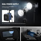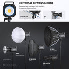 - Montura Bowens y ventilador silencioso : el reflector incluido con un interior con patrón de escala puede distribuir uniformemente la fuente de luz. La montura Bowens puede funcionar con softboxes, snoots, beauty dish y otros modeladores de luz. El zócalo para paraguas permite montar un paraguas de fotografía y el reflector a la vez. El ventilador silencioso puede reducir automáticamente el calor en función de las temperaturas de funcionamiento reales para brindar protección contra el sobrecalentamiento y entornos de disparo silenciosos.