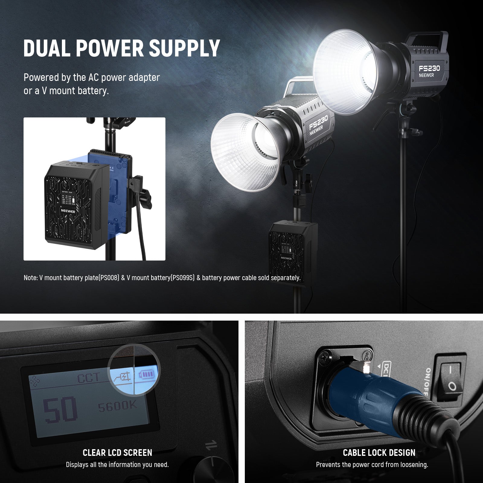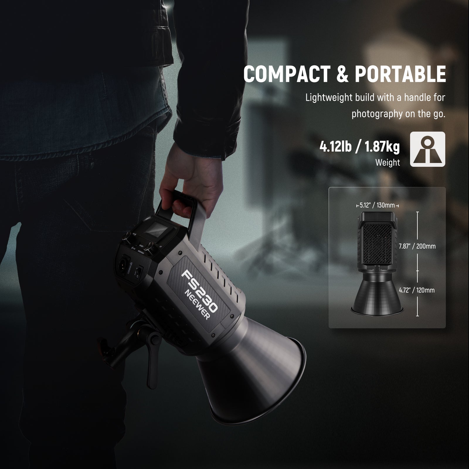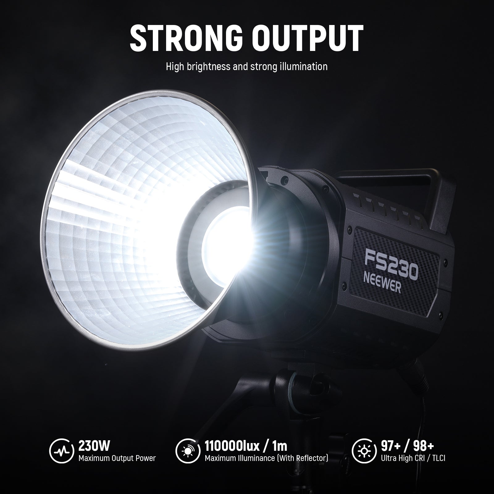 - Luz de estudio compacta y potente de 230 W : la luz de video LED NEEWER FS230 (enchufe estadounidense) utiliza LED COB eficientes para una salida excepcional de 230 W y una iluminación máxima de 110 000 lux/m. El foco portátil pesa solo 1,7 kg, mide 200 x 130 x 120 mm y tiene un adaptador de montaje de soporte con inclinación flexible de 180°, ideal para iluminación de fotografía de retrato, entrevistas, grabación de videos de YouTube/TikTok, filmación, transmisión en vivo y producción de estudio.