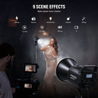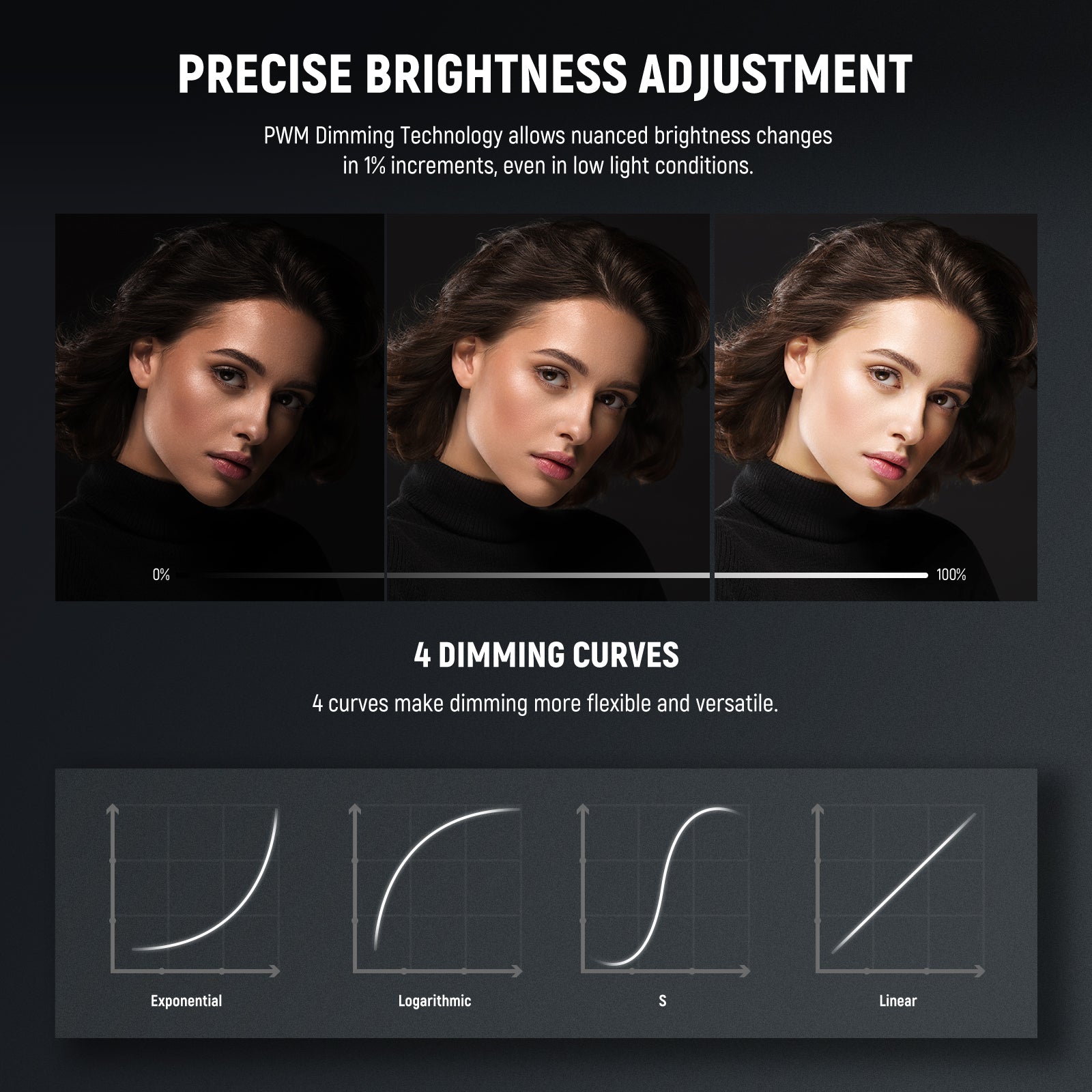 - Atenuación PWM precisa y luz natural de 5600 K : la tecnología de atenuación PWM permite un ajuste de brillo preciso de 0 a 100 % en incrementos del 1 % sin parpadeos y proporciona 4 tipos de atenuación (exponencial, logarítmica, S y lineal) para una atenuación precisa en diferentes condiciones. La luz natural fría de 5600 K ofrece una temperatura de color uniforme. El alto CRI 97+ y el TLCI 98+ garantizan una reproducción fiel del color. Los 9 efectos FX hacen que los videos sean creativos y distintos