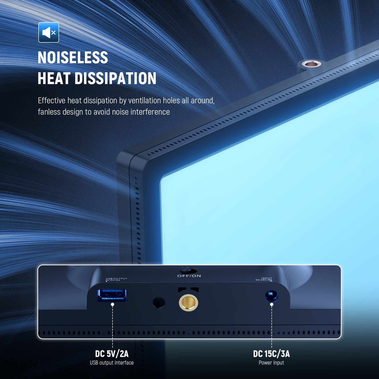 - Sistema de refrigeración eficiente y silencioso : este panel de luz LED RGB está fabricado con material de conducción de calor y diseñado con rejillas de ventilación por todos lados para garantizar una disipación de calor eficaz y oportuna, evitando problemas de mal funcionamiento por sobrecalentamiento y extendiendo la vida útil de la luz de relleno de transmisión. El sistema de refrigeración sin ventilador funciona silenciosamente para minimizar la interrupción del ruido durante el proceso creativo, lo que reduce significativamente la necesidad de un extenso trabajo de posproducción.