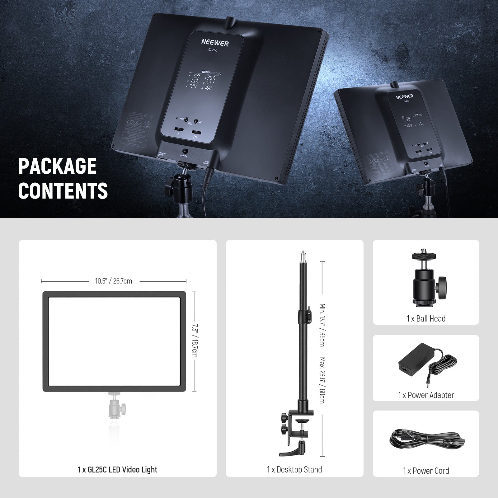 - Luz de borde iluminada a todo color : la GL25C con 108 LED utiliza la última tecnología de iluminación de borde, que ofrece una iluminación suave y sin parpadeos con una iluminación máxima de 2500 Lux/0,5 m a una potencia constante de 25 W, lo que permite ajustar el brillo del 0 % al 100 %. La luz de video tiene múltiples modos de iluminación: CCT (2900 K-7000 K y valor GM ±50), HSI (H: 0-360°, S: 0-100 %), RGBCW (R/G/B/C/W: 0-255), FX (18 efectos de escena), lo que brinda infinitas posibilidades para lograr ambientes de iluminación diversos y creativos para transmisiones en vivo