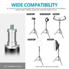 • Tornillo de montaje universal: el tornillo de montaje estándar de la industria de 1/4” es universalmente compatible con cámaras DSLR, luces de video LED, luces anulares, luces estroboscópicas, monoluces, reflectores, softboxes y otros dispositivos de hasta 22 lb (10 kg).