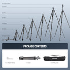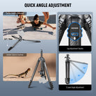 - Altura de liberación rápida mediante hebillas de resorte : las hebillas de metal accionadas por resorte se abren y se desbloquean rápidamente con un movimiento de apertura parcial, lo que permite un ajuste de altura rápido, seguro y estable. Con patas de tubo de 5 secciones, el trípode portátil se puede ajustar de 18"/46 cm a 61"/155 cm y ofrece tres ángulos fijos de 23°, 55° y 83°. La columna central se puede convertir o invertir para tomas macro en ángulo bajo a una altura de 5,9"/15 cm; la columna central también incluye un gancho incorporado para colgar pesas.