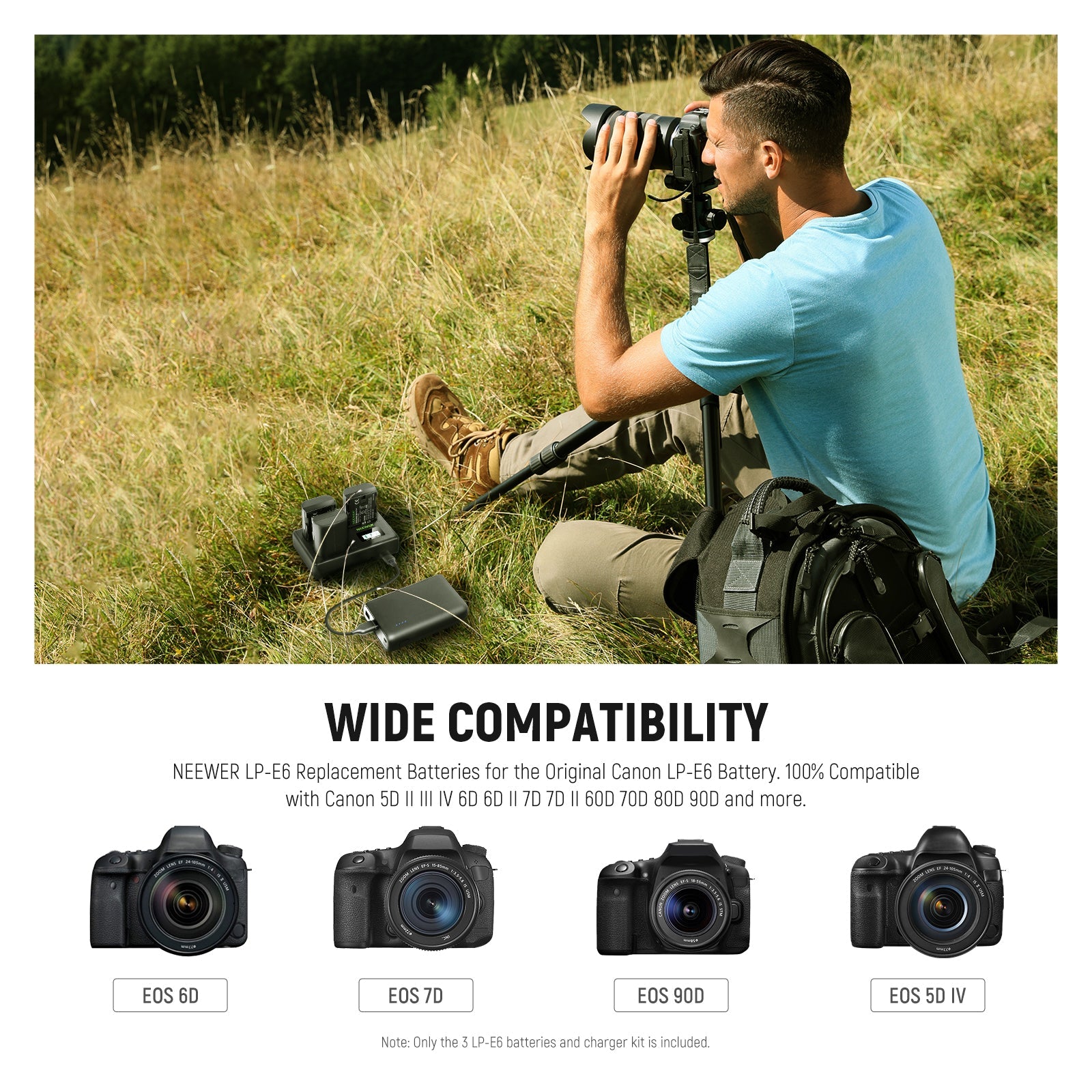 - Totalmente compatible con cámaras Canon alimentadas por batería LP-E6: las baterías de repuesto LP-E6 de NEEWER son totalmente compatibles con las cámaras Canon EOS 5D Mark II, 5D Mark III, 5D Mark IV, 5D SR, 60D, 60Da, 6D, 70D, 7D y otros dispositivos alimentados por baterías LP-E6 y LP-E6N. El cargador es compatible con los paquetes de baterías de iones de litio LP-E6, LP-E6N y LP-E6NH.