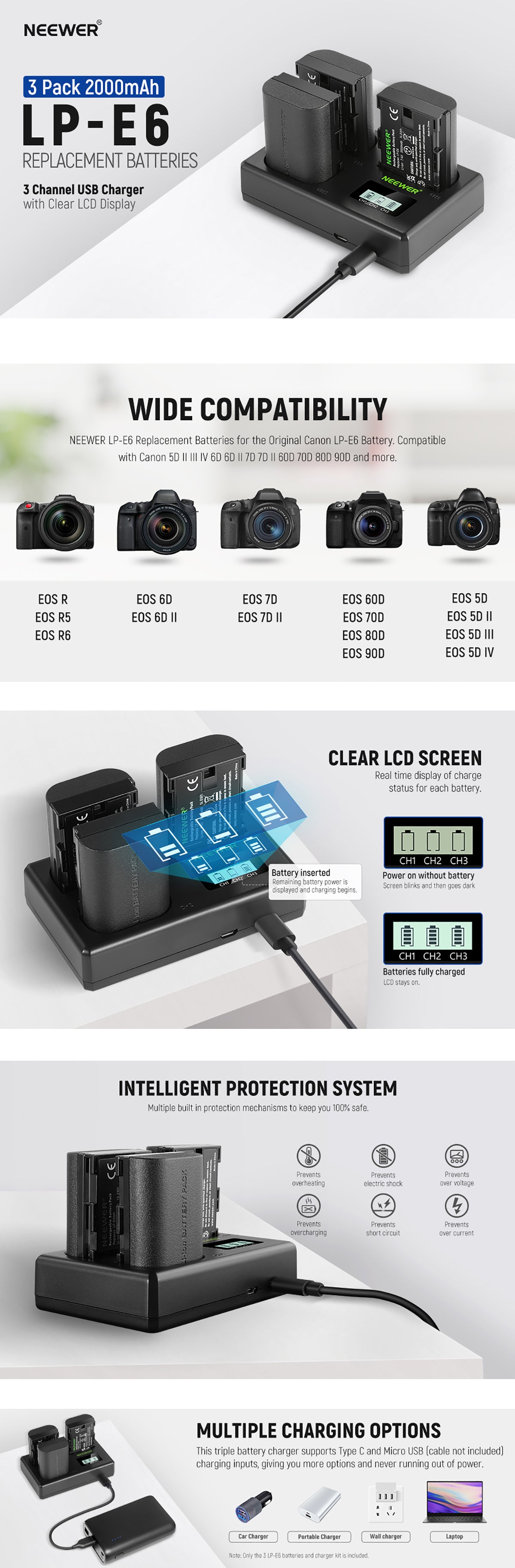 Más potencia para tu cámara: con tres baterías LP-E6 de 2000 mAh a mano, puedes mantener tu cámara cargada y no perder nunca la oportunidad de capturar momentos inolvidables en tu vida. Las baterías compactas y livianas no te supondrán ninguna carga al tomar fotografías al aire libre.